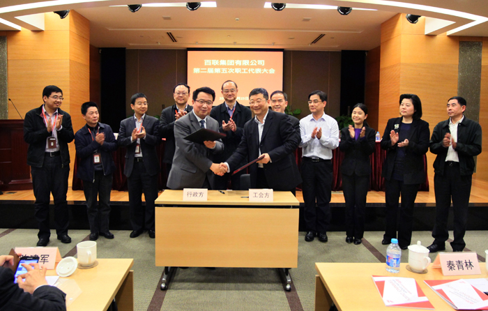 12月25日,集团二届五次职工代表大会在集团总部举行。大会号召全体职工在集团党委的领导下,充分认识和牢固树立“百联的出路在于深化改革,百联的未来在于转型创新”的理念,紧紧围绕集团提出的“三个突破、一个加强”总体思路,积极投身到《百联集团三年行动规划》的落实中去,为集团早日成为国内领先、并初步具备国际竞争力的商贸流通企业集团而努力奋斗。
