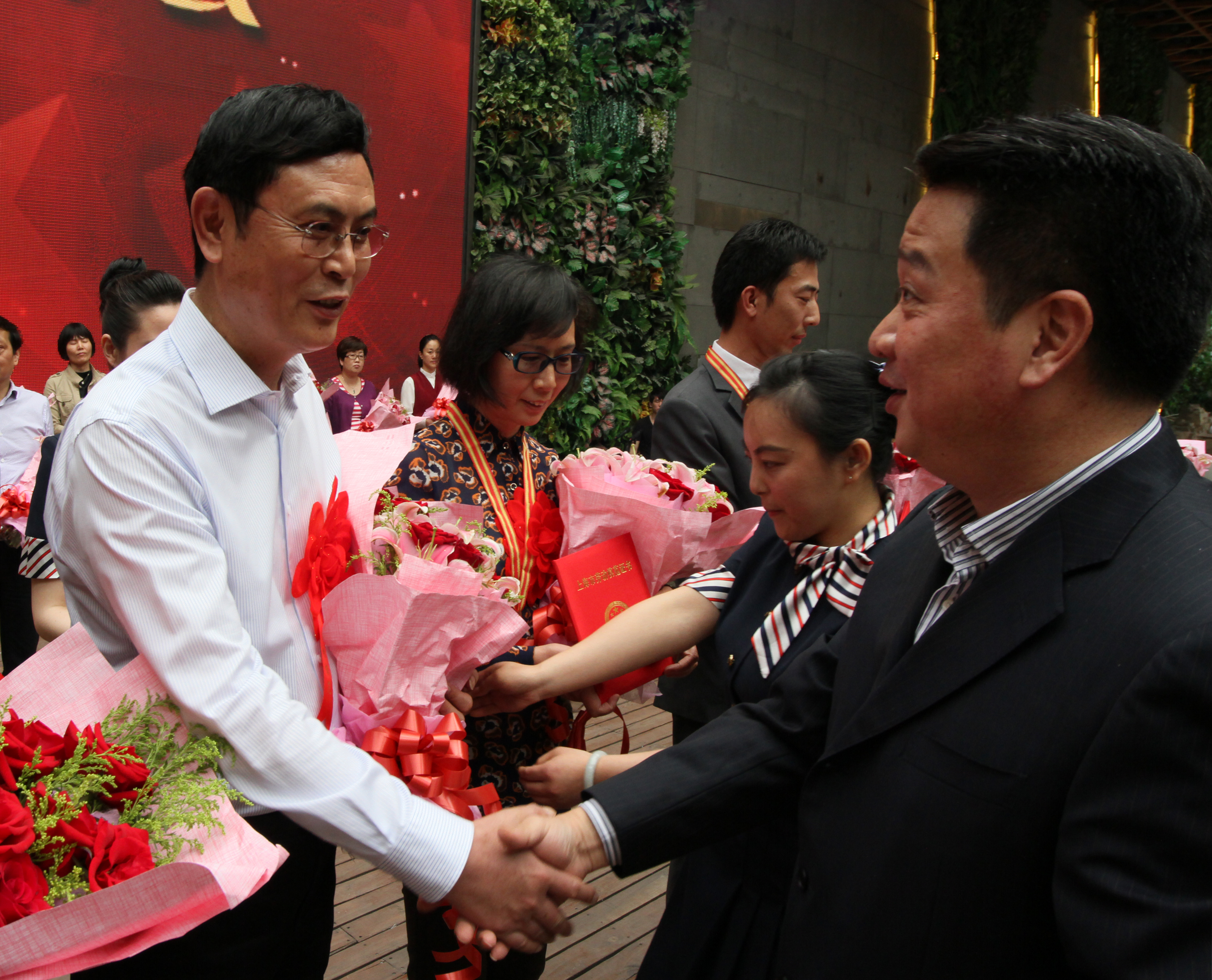 《务实进取的百联人——劳模先进展示片》拉开了劳模先进表彰仪式的序幕,全国劳动模范许宁、上海市劳动模范、上海市模范集体、全国财贸轻纺烟草行业劳模创新工作室、全国青年文明号、上海市厂务公开民主管理工作先进单位、上海市三八红旗手(集体)、集团“五项先进”等获奖单位代表及个人受到大会表彰。《追梦创新的百联人——百联集团员工投身商务电子化项目系列活动剪影》介绍了各级工会发动员工参与商务电子化项目的过程和效果。“i百联,听你说”征文大赛收到621篇征文、“i百联,秀创意”百联通会员卡卡样设计大赛收到386件作品,“i百联,秀风采”情景主持大赛共征集到120个视频,“i百联社区”注册人数截止5月11日达到24527人,并获得了18余万次的点赞投票。