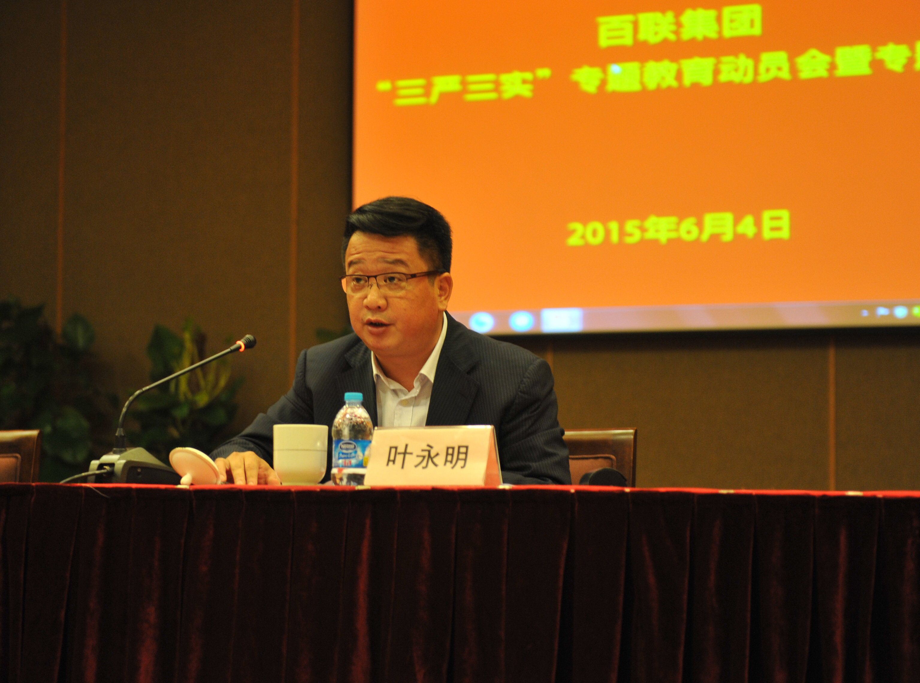 6月4日下午,集团党委在百联大厦3楼会议厅举行“三严三实”专题教育动员会。集团党委书记、董事长陈晓宏为与会人员上了“三严三实”专题党课,集团纪委书记王春华宣读专题教育实施方案。动员会由集团党委副书记、总裁叶永明主持并对贯彻落实会议精神提出要求。