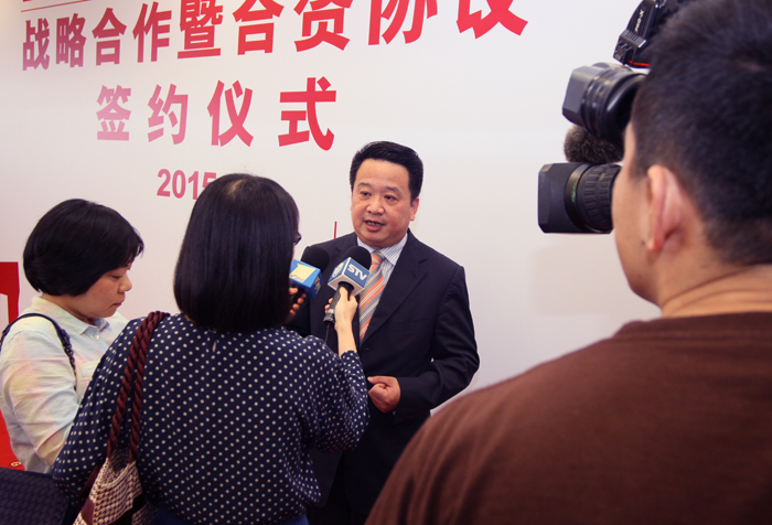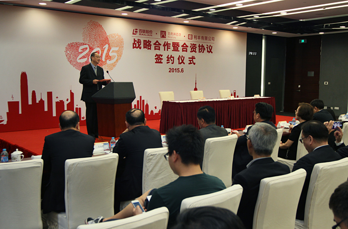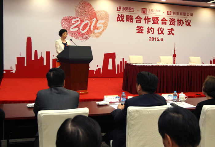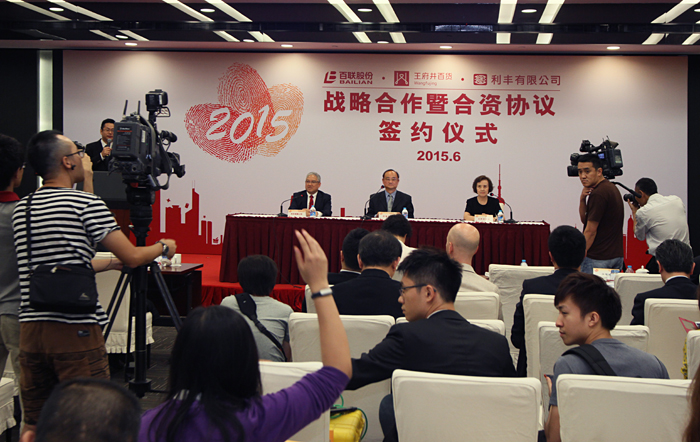 百联集团董事长、百联股份董事长陈晓宏、王府井集团董事长刘冰、利丰集团董事局主席冯国纶先后发表热情洋溢的致辞,对三方强强联合、优势互补、相得益彰的合资合作充满信心、充满期待,并代表三方在协议书上签字。签约仪式后,陈晓宏、刘冰、冯国纶共同会见记者并回答了媒体记者提问,百联集团总裁叶永明接受了媒体采访。