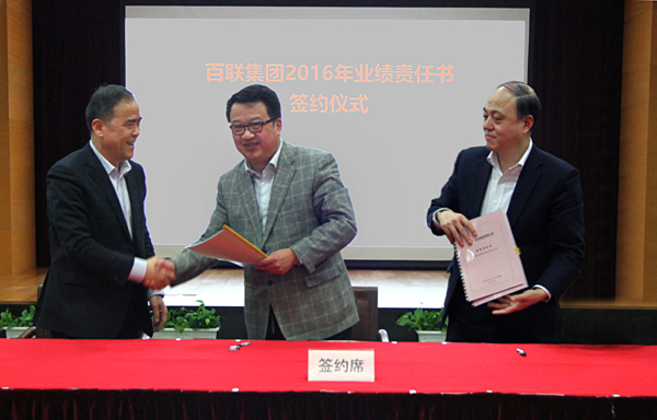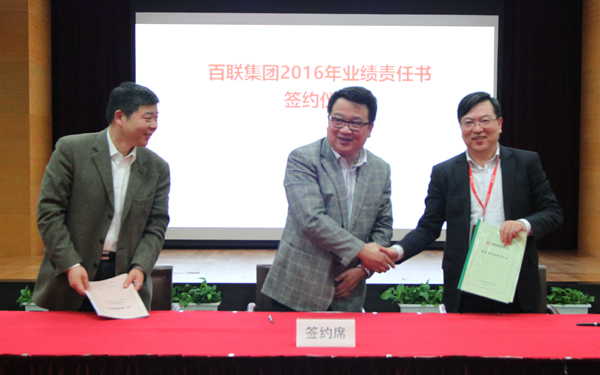 (叶永明与百联股份总经理钱建强、党委书记王逢祥签订责任书)