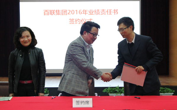 叶永明在讲话中提出,百联各级组织、各成员企业要紧紧围绕集团2016年工作会议提出的“积极举措、确保增长、聚力变革、创新突破”指导思想以及党建“三建三创”的主题活动要求,抓紧抓早百联2016年各项工作,开好局、起好步。叶永明结合2月19日在上海市政府工作会议上杨雄市长的讲话精神提出三点要求:一要充分认清形势,增加工作紧迫感和责任感,要严格控制现金流、控制经营成本、坚定不移优化产业结构,按中央提出的五大发展理念推进创新转型;二要结合供给侧改革在改革创新上下更大功夫,在补短板上花更大气力,进一步完善百联“十三五”规划;三要狠抓落实,强化问题导向、强化目标管理、强化责任担当。叶永明强调指出,本次签署的不仅仅是责任书,更是接力棒、军令状,希望各公司(中心)抓紧时间分解、细化指标、落实具体举措,为集团“十三五”开好局、起好步。