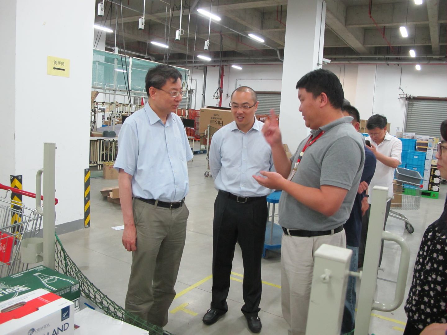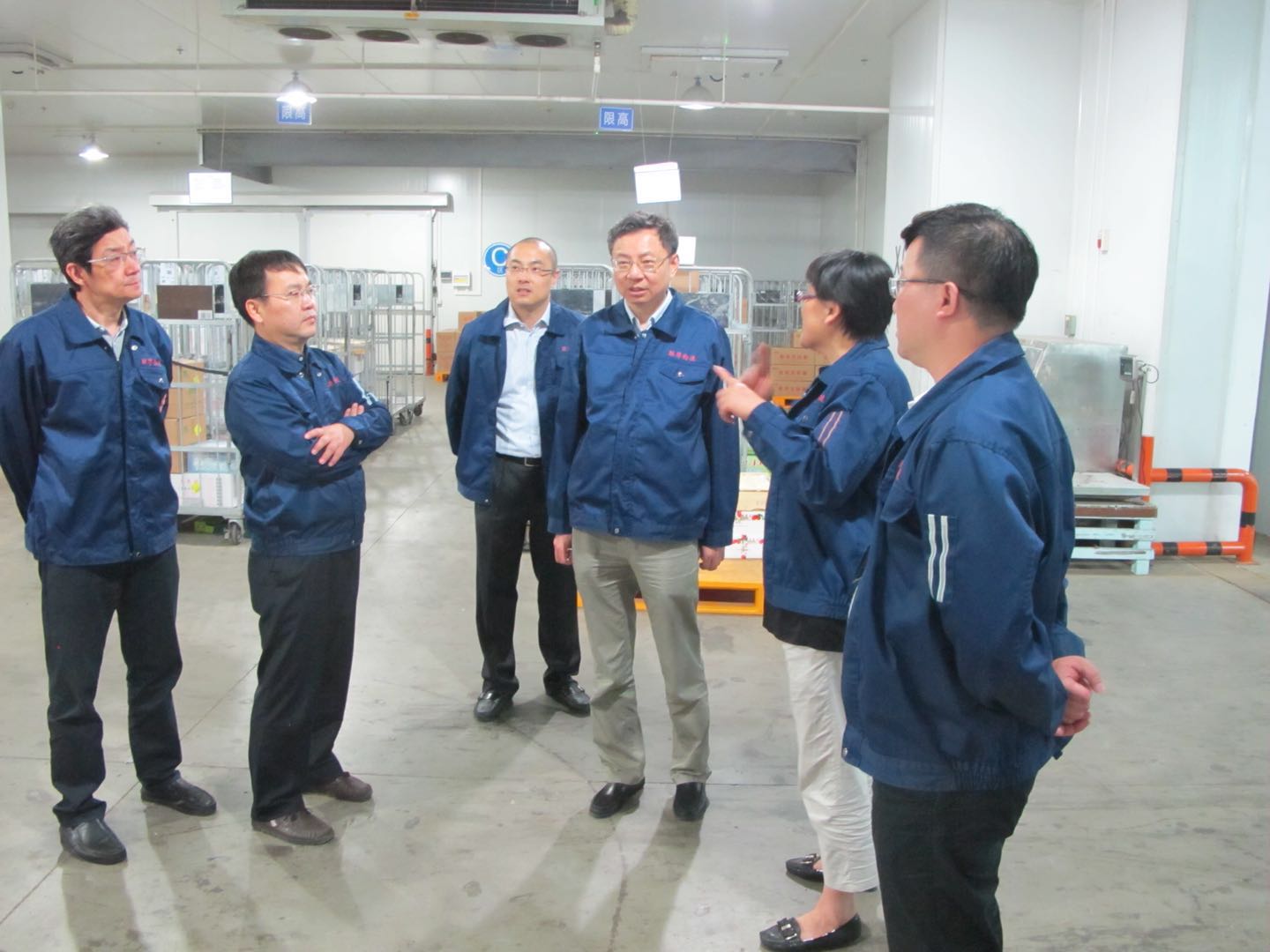 吴振国在孙丰、梁宝龙和赵达监事陪同下,视察线上、线下常温仓和冷库仓。