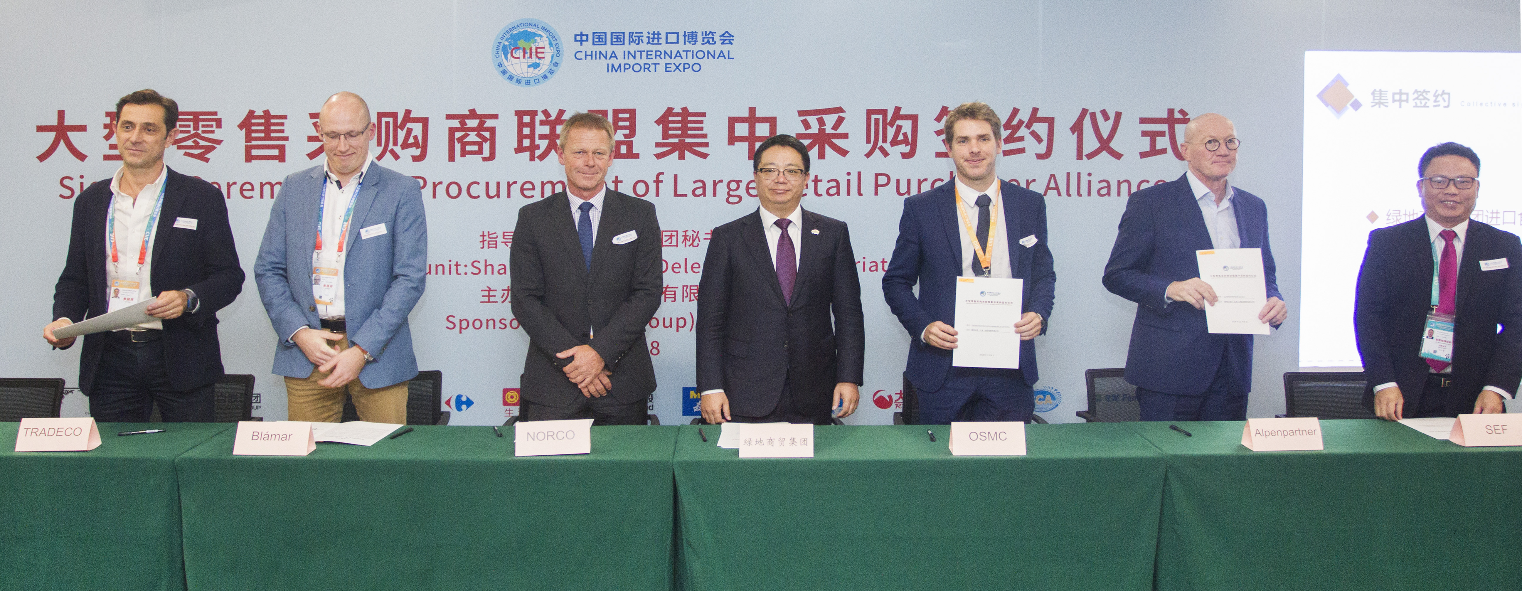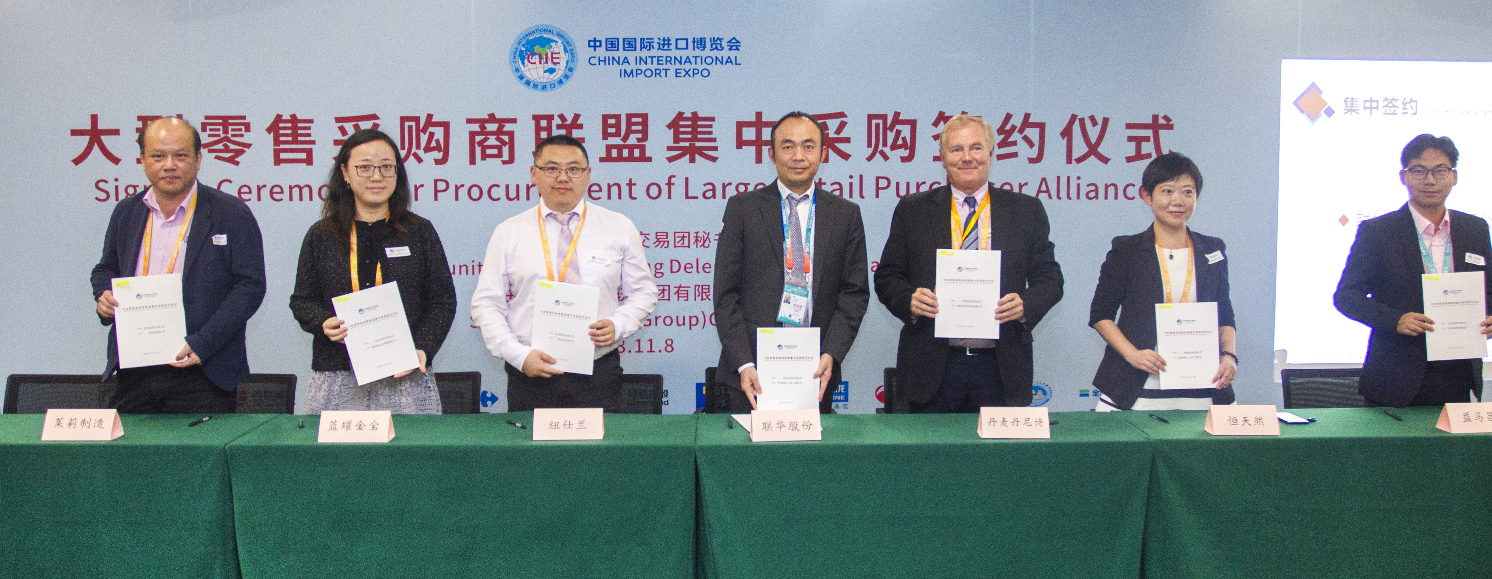 11月8日下午,由进口博览会上海交易团秘书处指导,百联集团主办的大型零售采购商联盟集中采购签约仪式在国家会展中心举行。百联集团、光明食品集团、绿地集团、家乐福中国、来伊份等上海大型零售采购商联盟会员企业,分五批与来自美洲、欧洲、大洋洲、亚洲15个国家和地区的厂商代表,就29个采购合作项目进行集中签约。