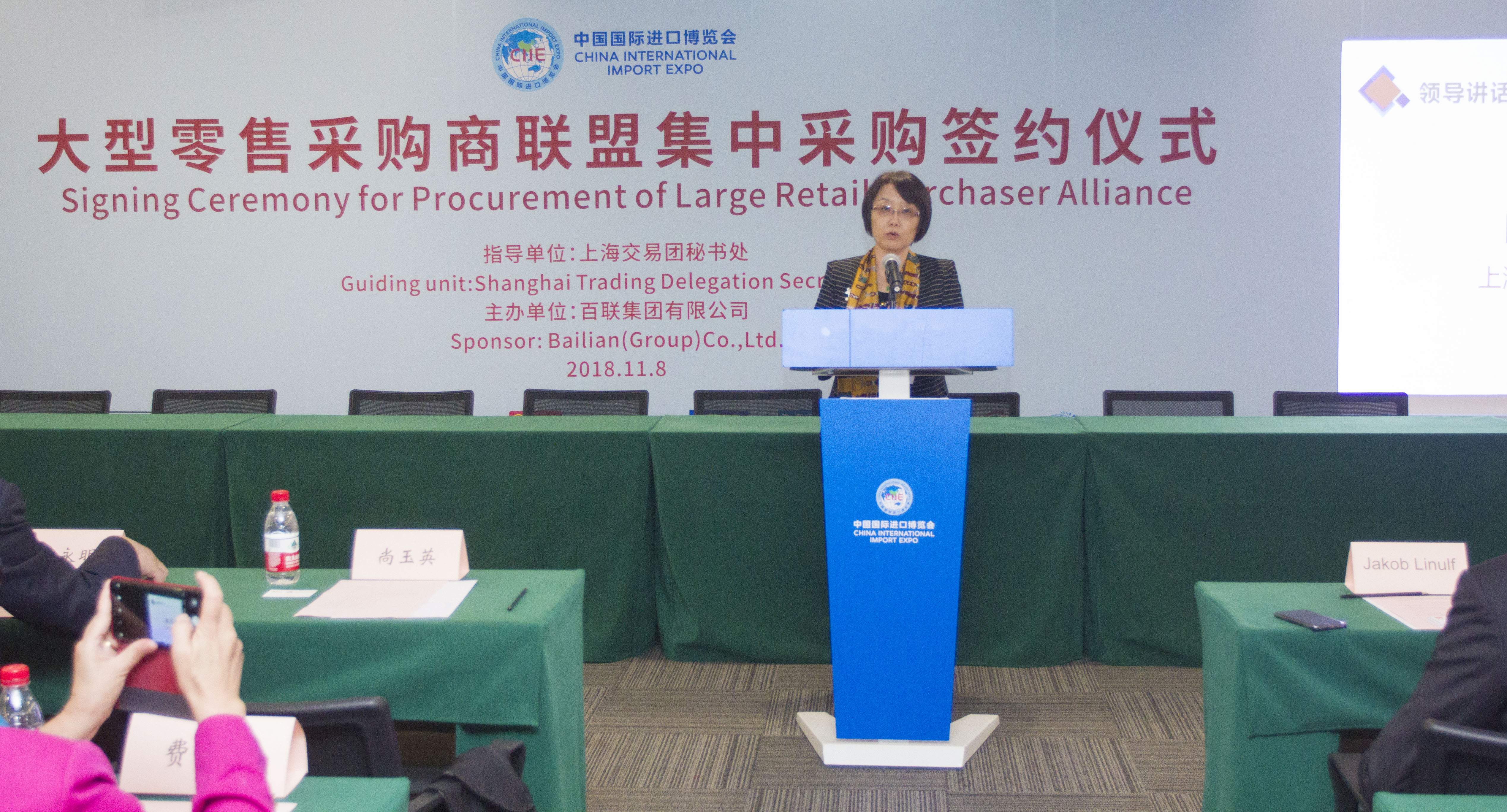 绿地集团、家乐福中国、来伊份相关负责人分别在签约仪式上致辞。部分外国驻华使领馆官员,百联集团领导班子成员,零售联盟会员企业相关负责人,采购商公司相关负责人,签约境外展商、品牌商公司相关负责人等共计约150人(其中境外代表约50人)出席签约仪式。