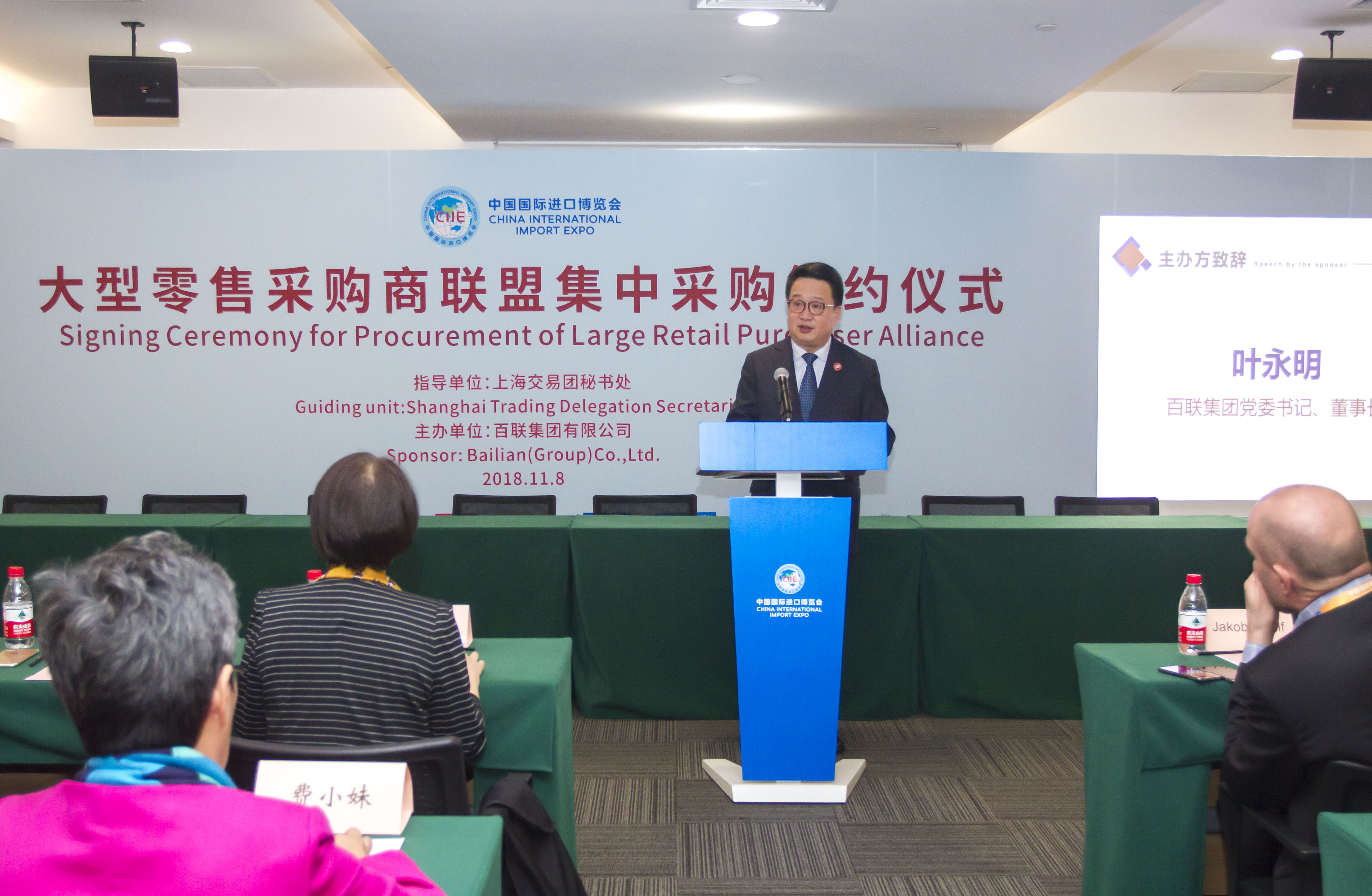 叶永明在致辞中指出,今年6月21日,在进口博览会上海交易团秘书处的指导下,百联集团牵头发起组建了上海大型零售采购商联盟。21家会员单位涵盖了国内外具有代表性的零售企业,包括沃尔玛、家乐福中国、麦德龙等世界500强企业,百联集团、光明食品集团、绿地商贸集团等大型国有企业、盒马鲜生、易果集团等新零售代表企业,以及豫园股份、上海新世界、东方购物等上海本地的龙头企业和上海市商业联合会、上海连锁经营协会等行业协会。