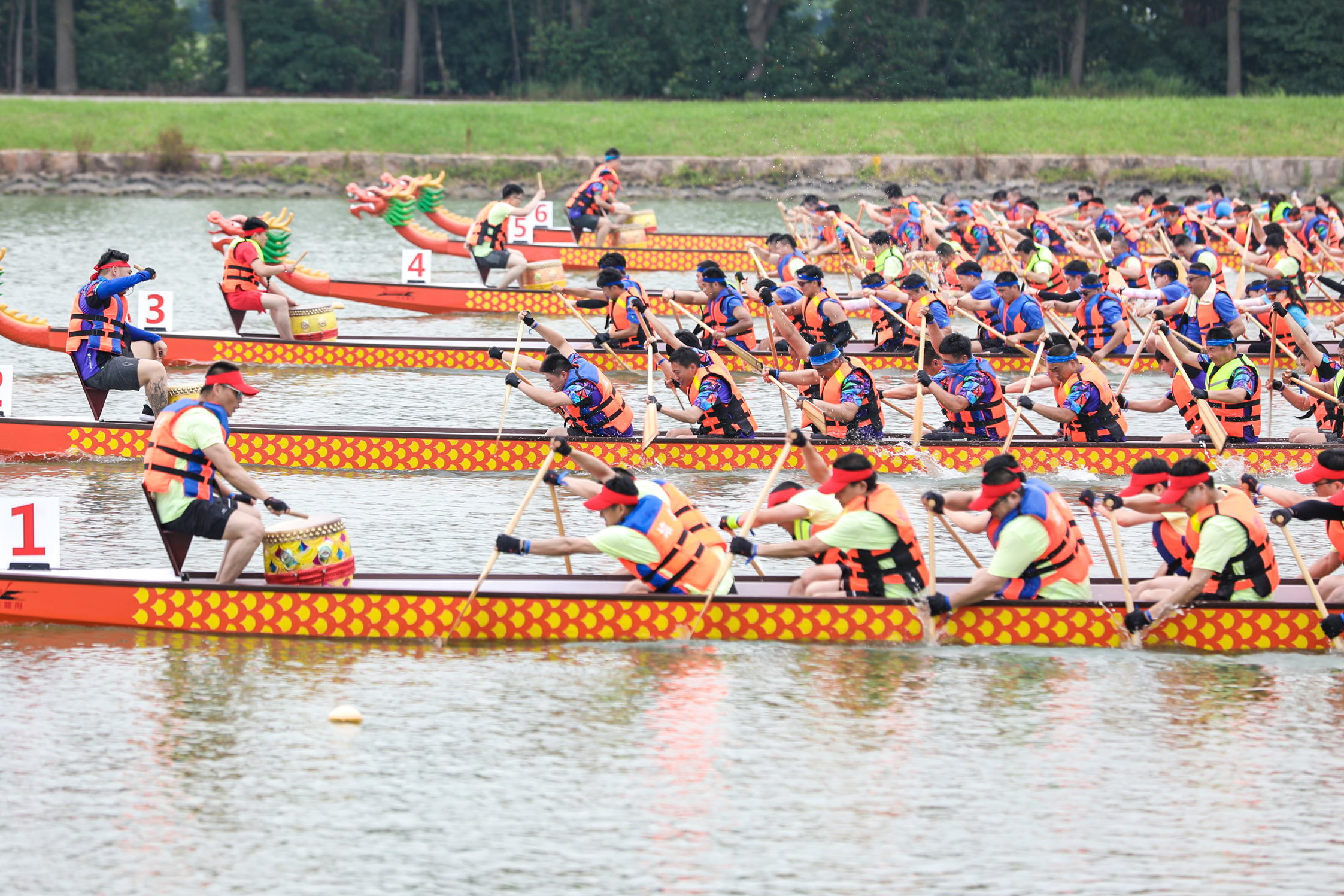 奋楫向前,鼓点激越催人进。百舸竟流,浆翻白浪齐争先。本次龙舟赛共有16支参赛队报名参赛。每支队伍共有18名职工划手运动员(其中4名为女职工)和鼓手1名,组委会为每艘龙舟配备专业舵手1名。比赛分预赛和决赛先后进行,赛程距离均为300米。以用时多少决定成绩先后,最终决出冠、亚、季军。