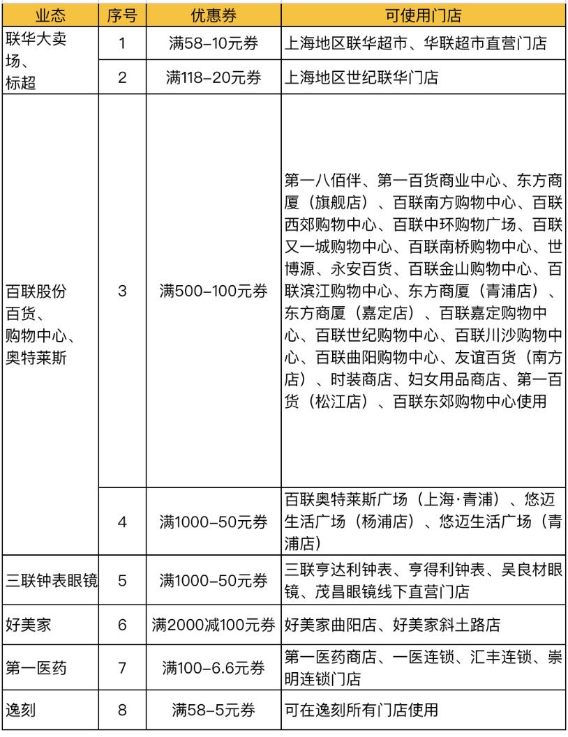 在上海地区的指定门店,每个用户每个券种限领一张,最多可得8张不同券种的消费券。