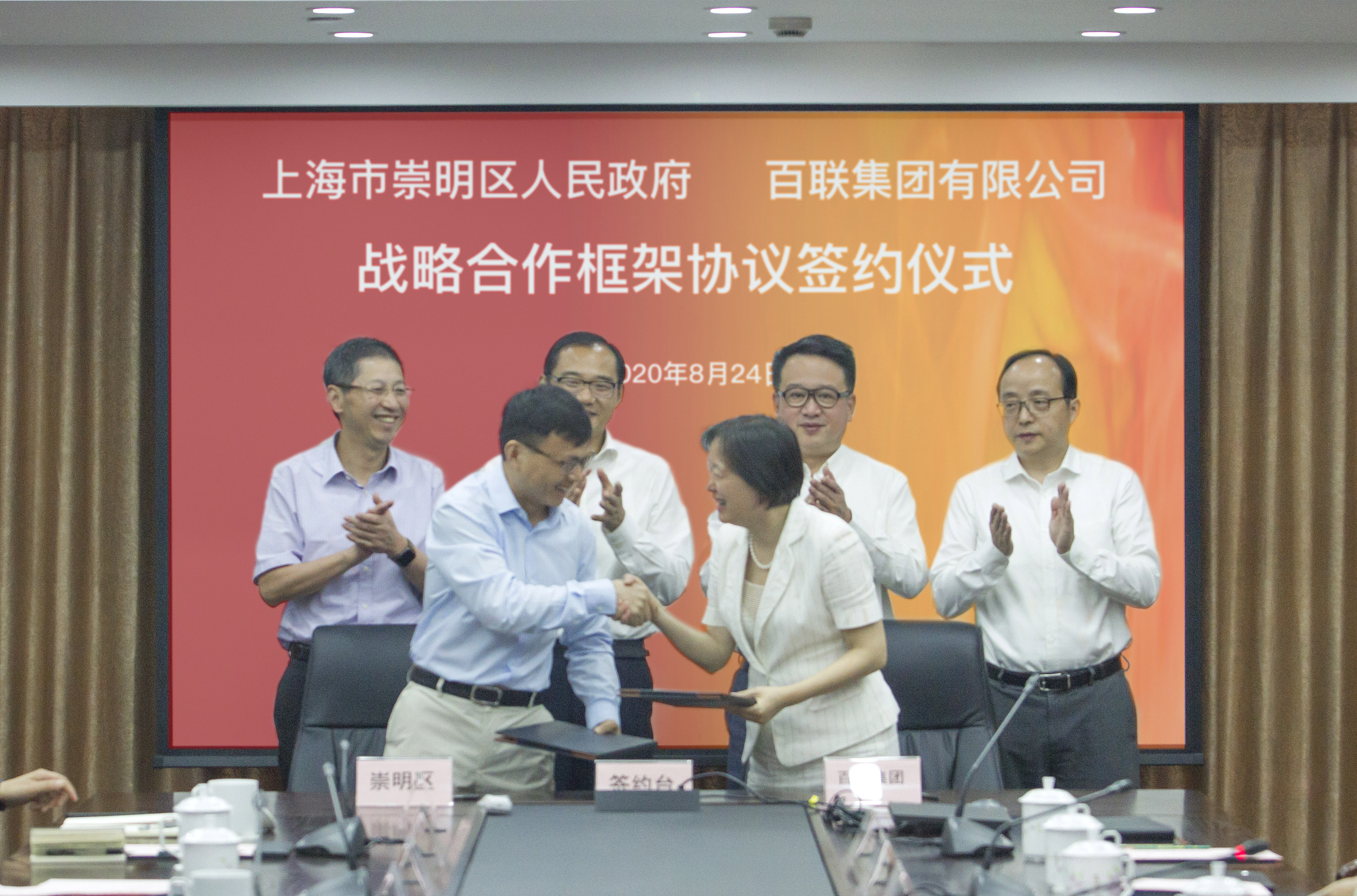 图为崇明区区长缪京、百联集团总裁徐子瑛代表双方签订战略合作框架协议