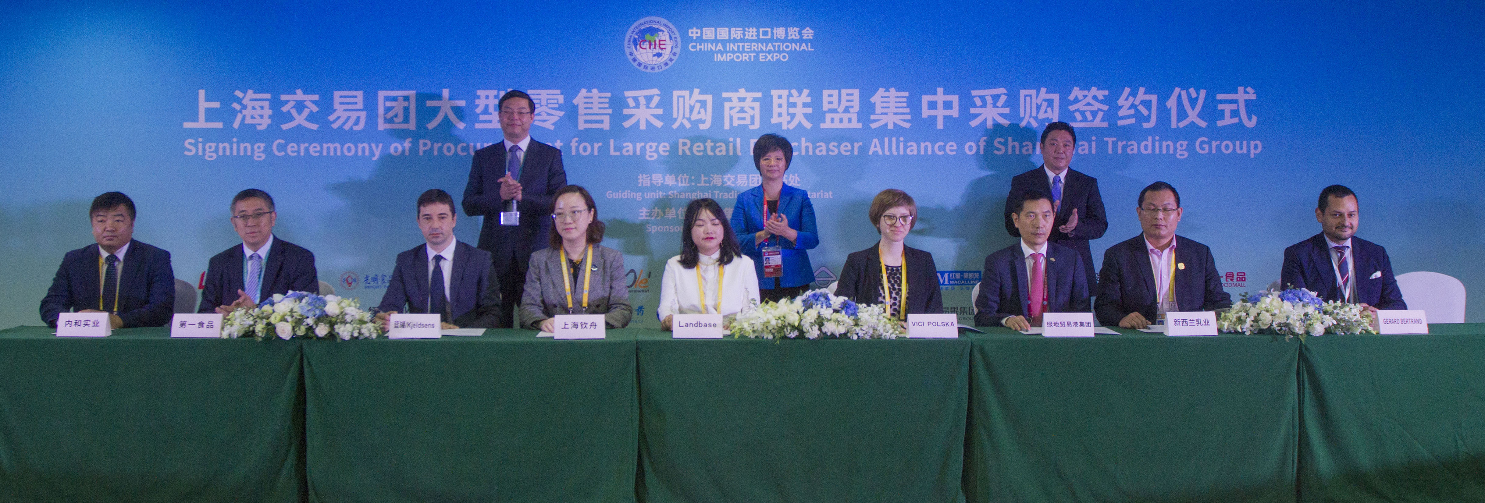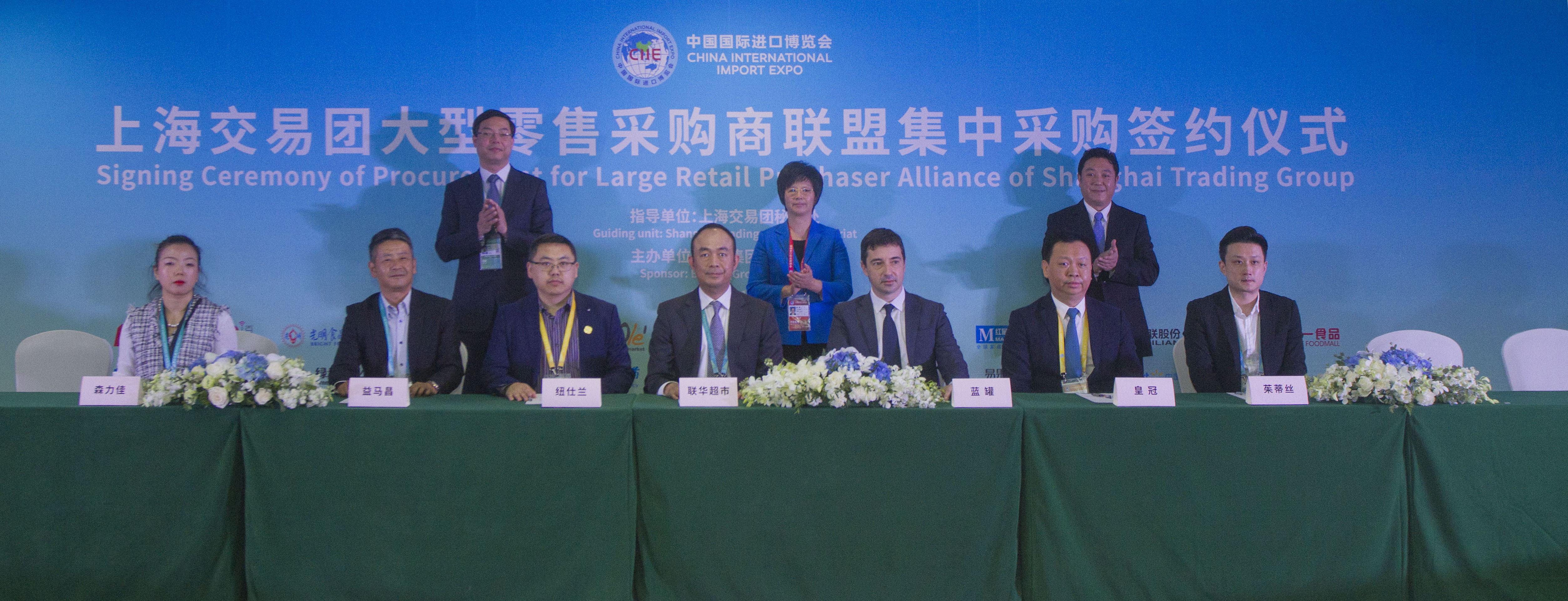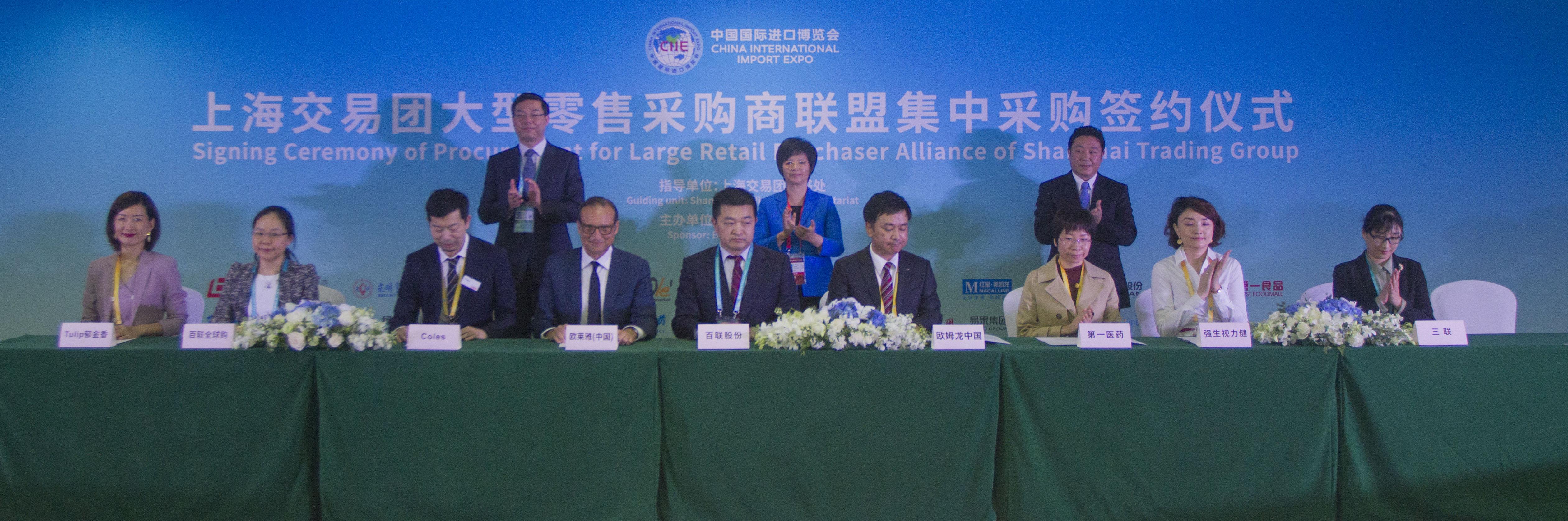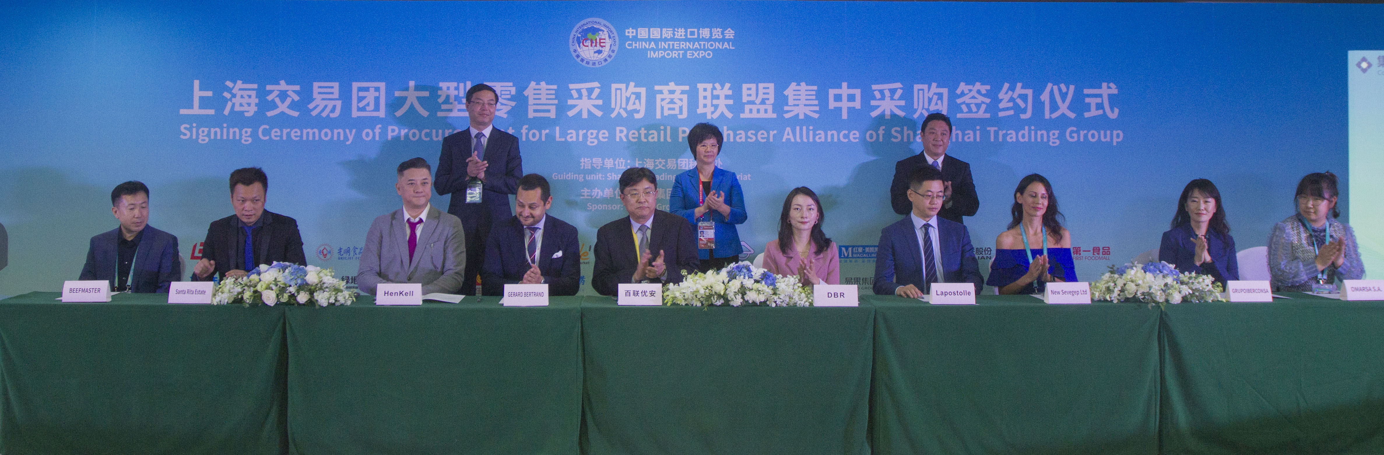 百联集团、光明食品集团、家乐福中国、绿地集团等30家上海大型零售采购商联盟会员企业,分别与来自美洲、欧洲、大洋洲、亚洲20个左右国家和地区的厂商及品牌商代表进行了集中签约。上海市政府副市长宗明,上海市政府副秘书长尚玉英,上海市商务委主任华源,商务部进博局副局长孔福安,上海市国资委副主任康杰,百联集团党委书记、董事长叶永明,百联集团党委副书记、总裁徐子瑛,光明食品集团财务总监肖荷花,绿地集团总裁助理薛迎杰,家乐福中国副总裁戴玮等出席仪式并见证签约。