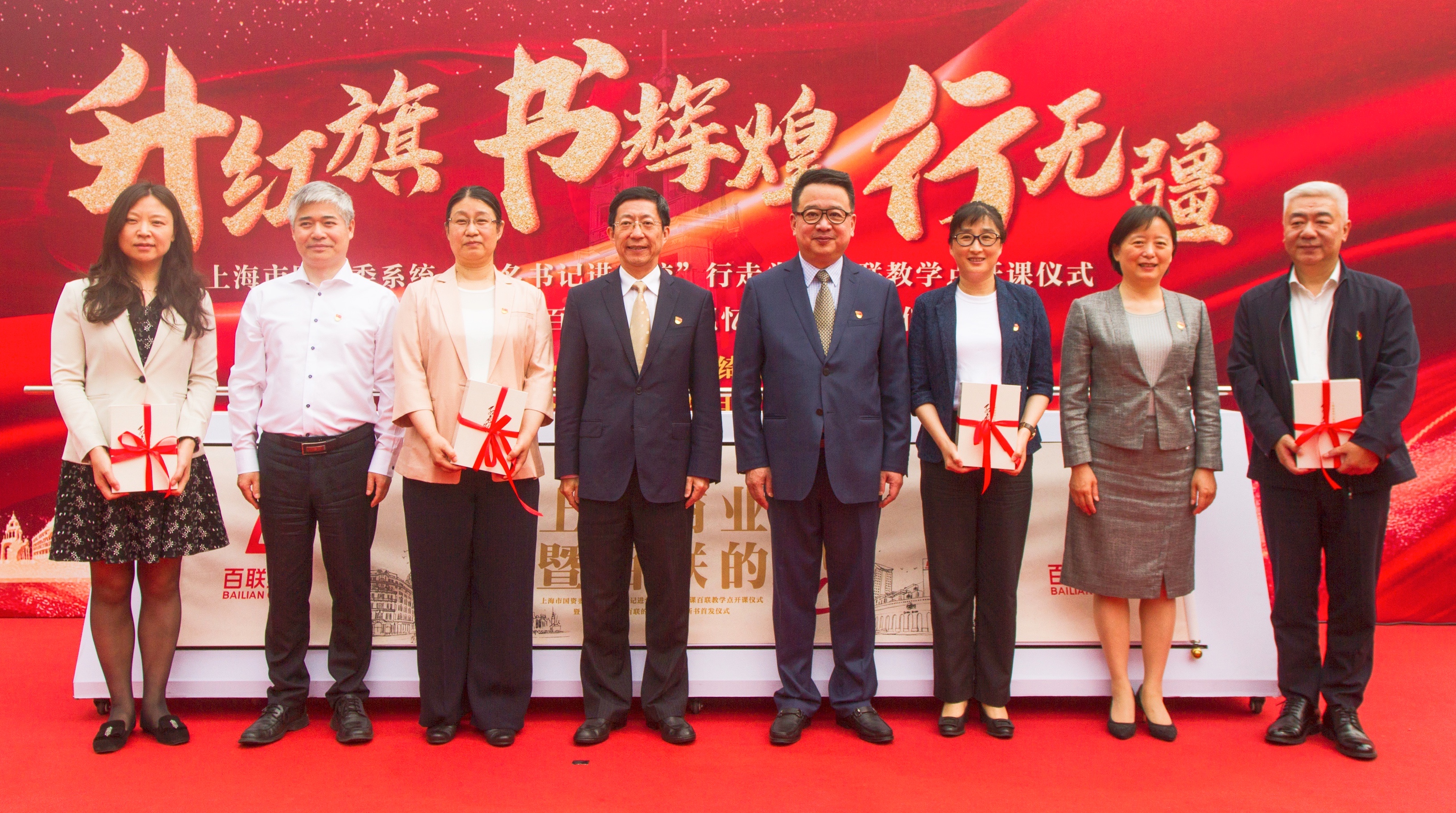 董勤、叶永明、徐子瑛、王庆洲等领导共同推动《上海商业暨百联的红色记忆》新书首发启动装置并向各二级公司(中心)党组织书记赠书。叶永明为百联集团党校“中华商业第一街红色记忆”行走党课教学点授旗。苏虹为“上海市国资委系统行走党课现场教学点”铜牌揭幕。金韶靖、沈丹娜为“中华商业第一街红色记忆”行走党课讲解员授胸牌。