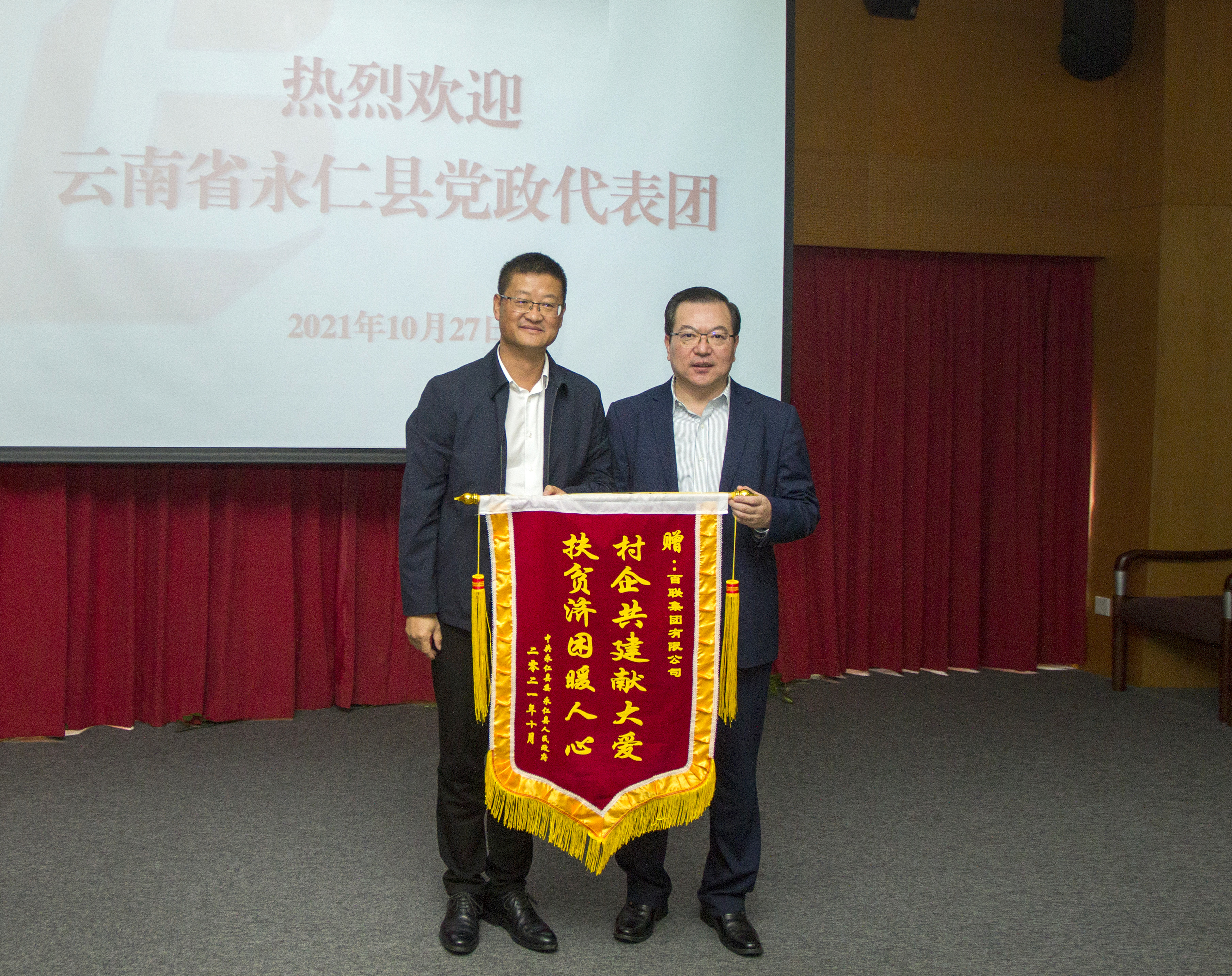 会上,永仁县委、县政府向百联集团赠送了“村企共建献大爱 扶贫济困暖人心”的锦旗。