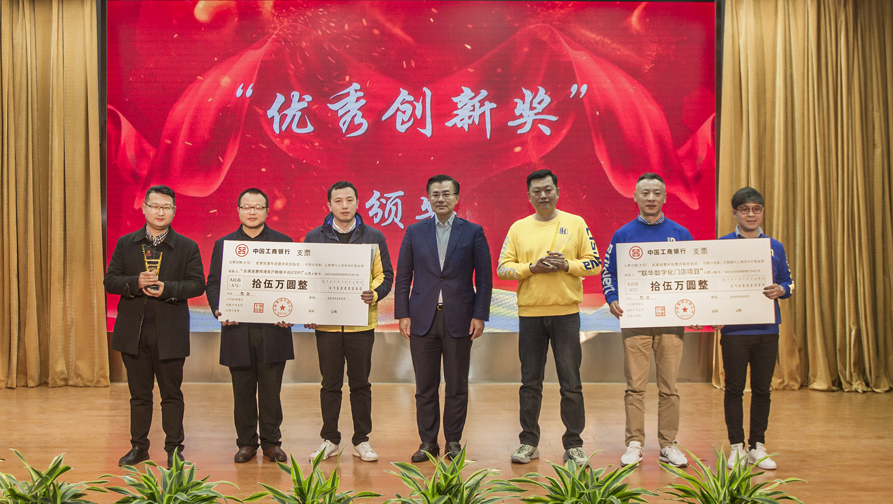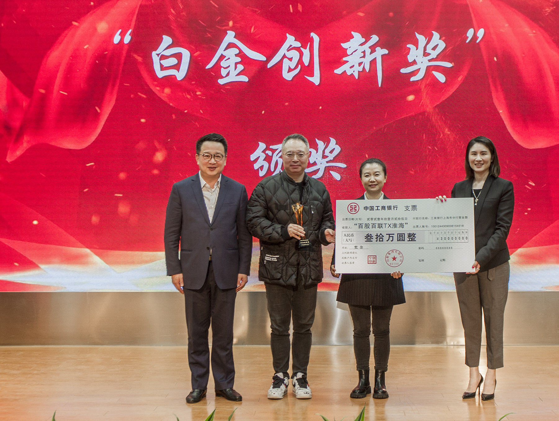 ▲ 叶永明为荣获“2021年度百联集团白金创新奖”代表颁奖