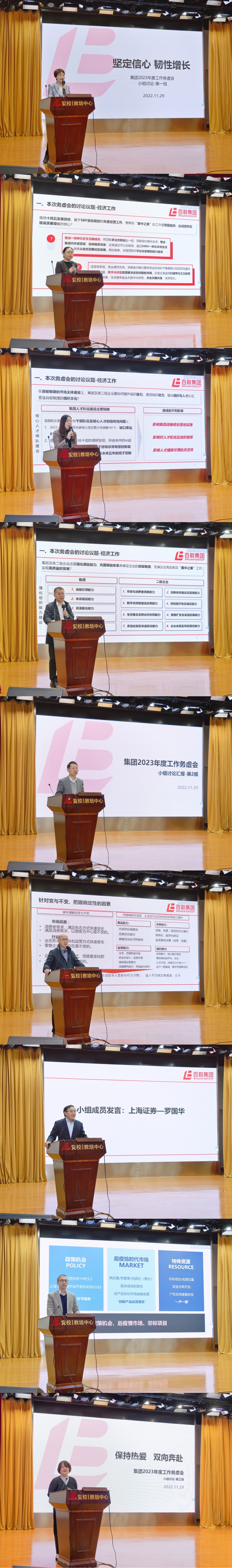 会议进行了分组讨论。三个讨论组在学习贯彻党的二十大精神和新党章要求下,就如何洞悉复杂严峻趋势,认清“变”与“不变”,围绕深化改革增长创新发展的基础上,识别“重中之重”工作,建立自驱敏捷的市场主体,以高质量党建推动集团整体高质量发展等议题进行充分讨论。三个讨论组分别以“坚定信心 韧性增长”、“坚持开创性、坚韧性、操作性的统一”、“保持热爱 双向奔赴”为主题,就2023年度经济工作和党建工作思路和举措作汇报交流。