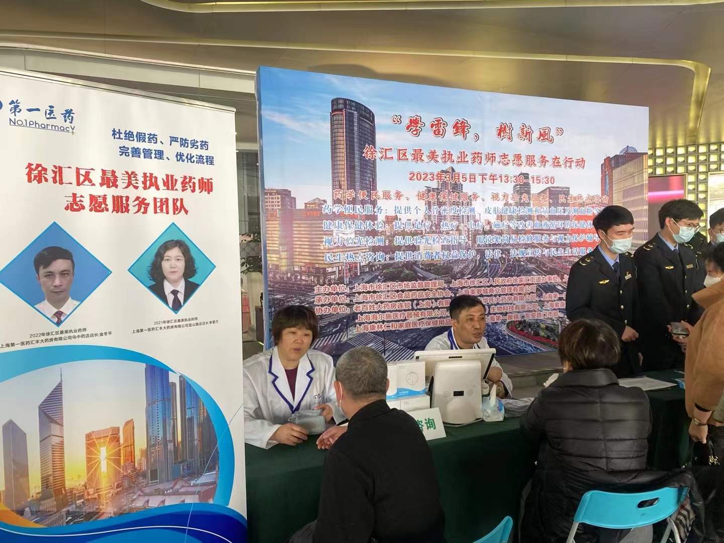 3月5日下午13:30-15:30,第一医药曾分别荣获2021年度、2022年度徐汇区最美执业药师的执业药师志愿者李爱兰和金冬平在美罗城门前的为民服务活动现场,为过往市民测量血压,检测骨密度,并以各自擅长的药学专业知识,为前来咨询用药的顾客解惑释疑,同时提供“治未病”健康养生指导。