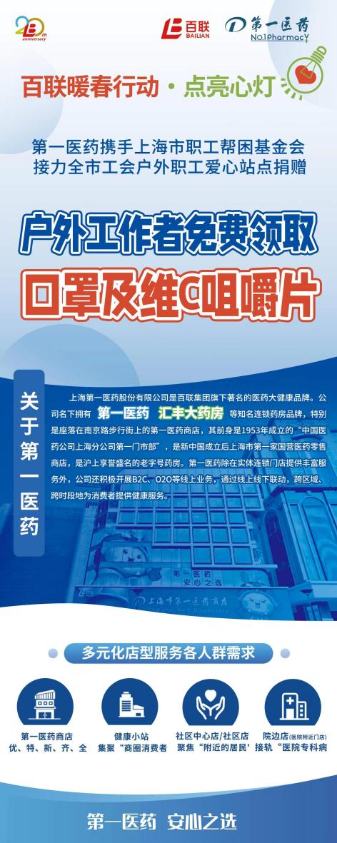 第一医药接力全市工会户外职工爱心站点捐赠,在全市工会59家户外职工爱心接力站,共派发2万个口罩与2000份维C咀嚼片。户外职工爱心接力站主要服务于环卫工人、外卖送餐员、交警等广大户外劳动者们,他们是创建文明城市的奉献者,也是城市环境的维护者,更是城市秩序安全的保障者。此次第一医药准备的口罩和咀嚼片,为广大户外劳动者们提供了暖心的健康支援,更好地保障户外职工的身体健康,全力传递春日温馨关怀。