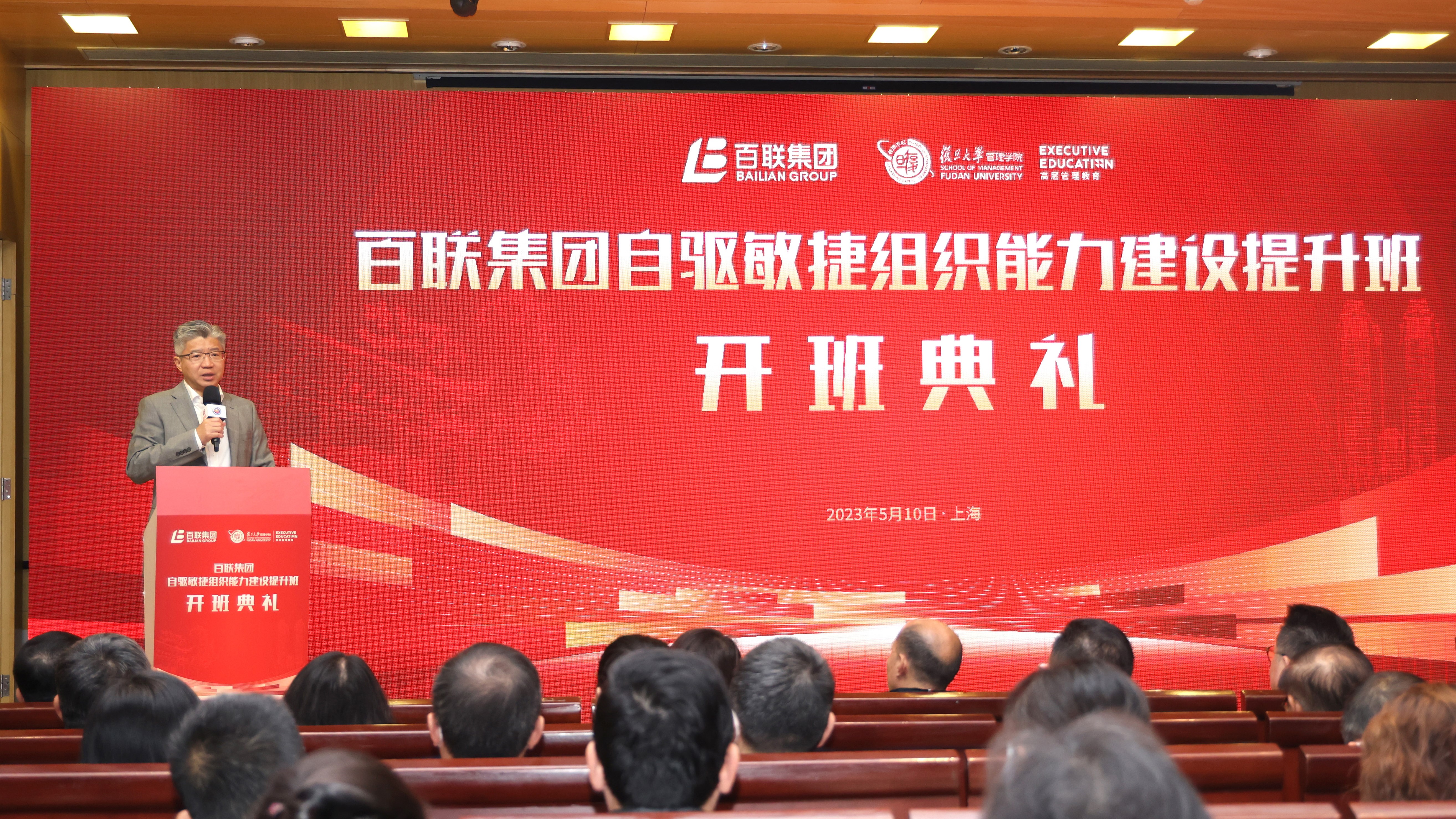陆雄文代表复旦管院作欢迎致辞。参与集团“自驱敏捷”市场主体建设项目的相关二级公司领导班子成员、集团总部部门负责人参加开班典礼及首次培训授课。