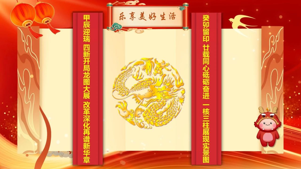 叶永明向集团系统全体干部员工致以新春问候和美好祝愿,并赠新春对联:“癸卯留印,廿载同心砥砺奋进,一核三柱展现实景图;甲辰迎瑞,四新开局龙图大展,改革深化再谱新华章。——乐享美好生活!” 集团领导班子成员集体拜年,恭祝大家新春快乐,身体健康,万事如意,龙年大吉!