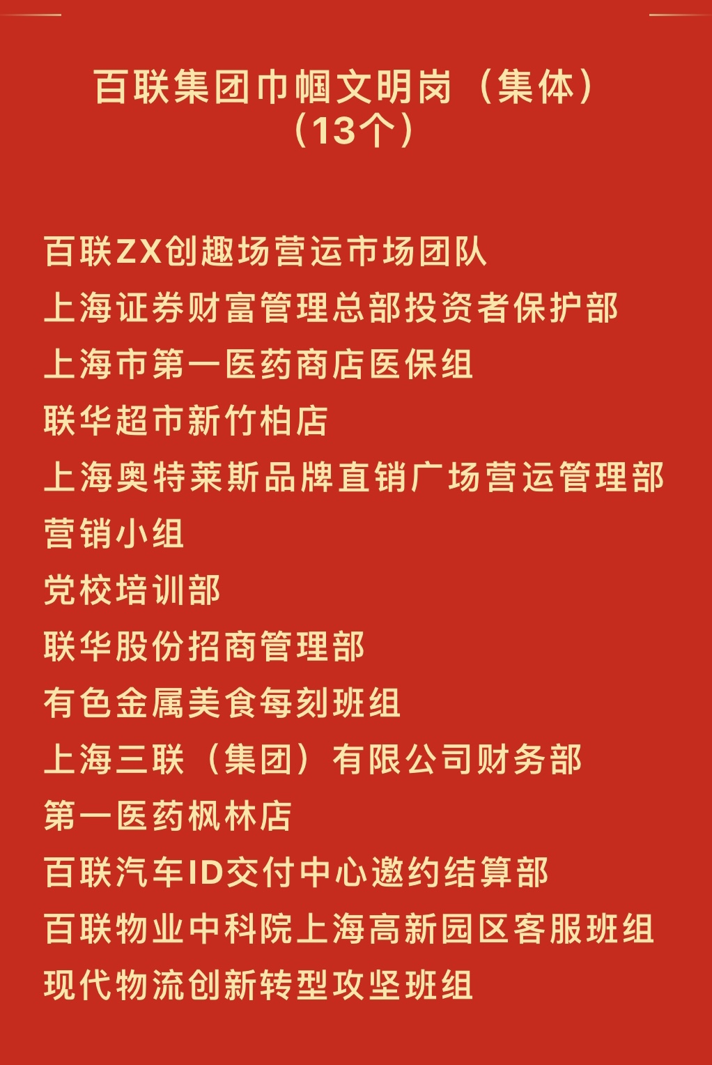 根据上海市妇联、上海市总工会公布2023年“上海市巾帼文明岗”的命名结果,百联集团旗下百联ZX创趣场营运市场团队、上海证券有限责任公司财富管理总部投资者保护部、上海市第一医药商店医保组、联华超市股份有限公司营运中心(上海)标超营运中心新竹柏店这4个班组榜上有名。