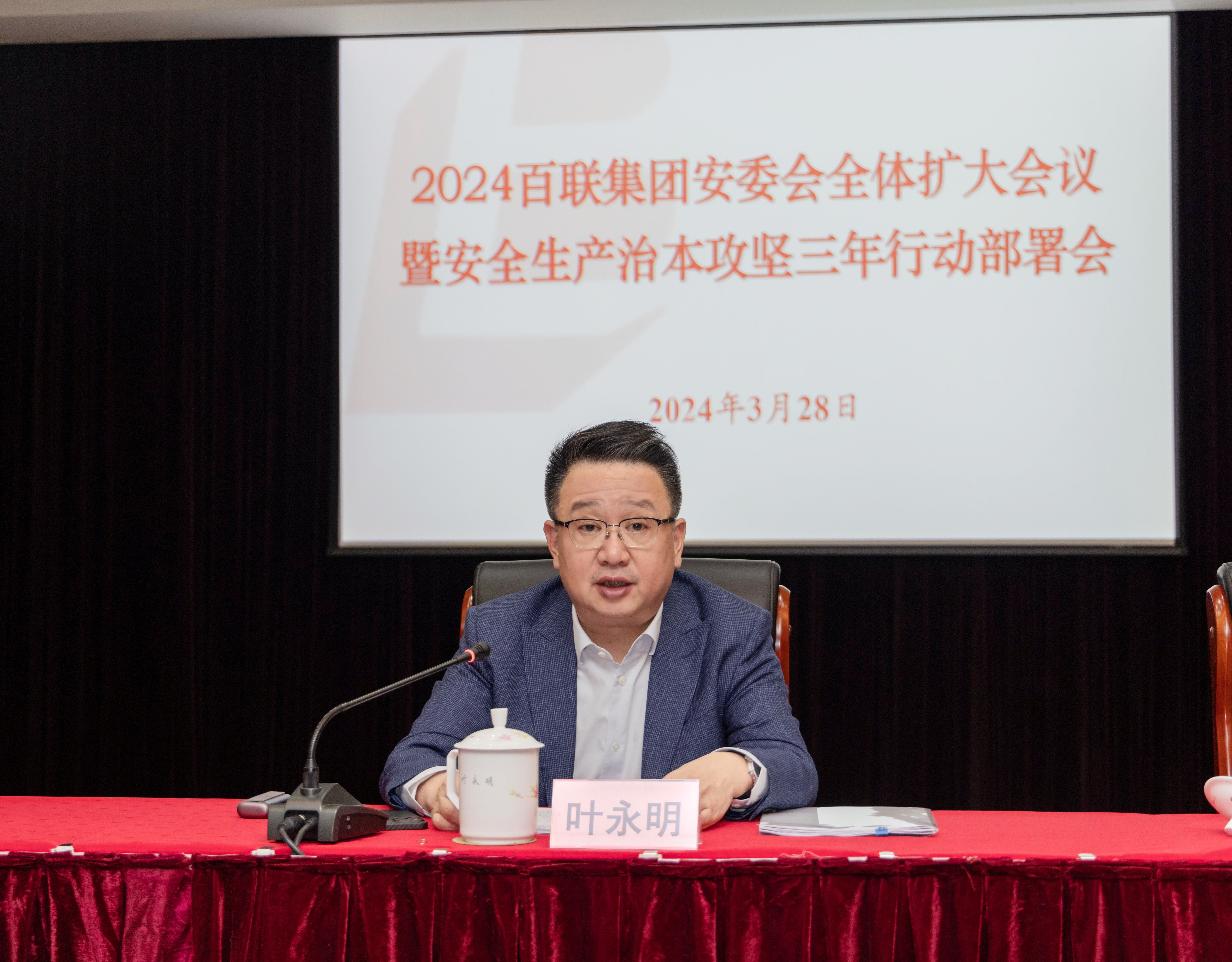 为深入贯彻习近平总书记关于安全生产的重要论述精神,认真落实全国、上海市和市国资委安全生产有关会议要求,动员部署安全生产治本攻坚三年行动,3月28日下午,百联集团召开2024年度安委会全体扩大会议暨安全生产治本攻坚三年行动部署会,回顾总结集团2023年安全工作,深入分析安全生产形势,全面部署2024年度安全重点工作。集团党委书记、董事长、安委会主任叶永明出席会议并讲话,集团党委副书记、总裁、安委会第一副主任濮韶华主持会议并部署集团安全生产治本攻坚三年行动。