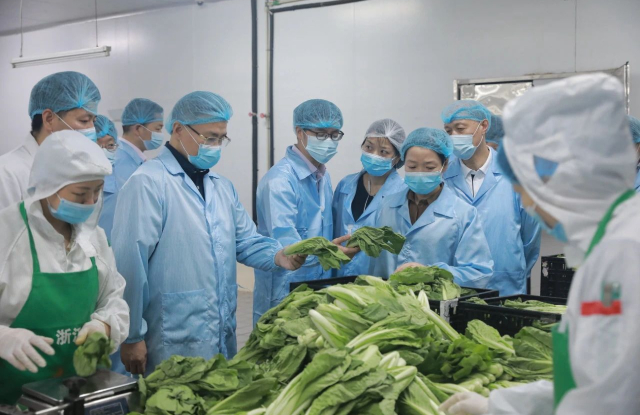 在浙江联华生鲜物流基地和加工中心,濮韶华一行重点考察了浙江联华智慧物流系统的实施应用,参观了生鲜产品检测室和精包装蔬菜加工生产线。