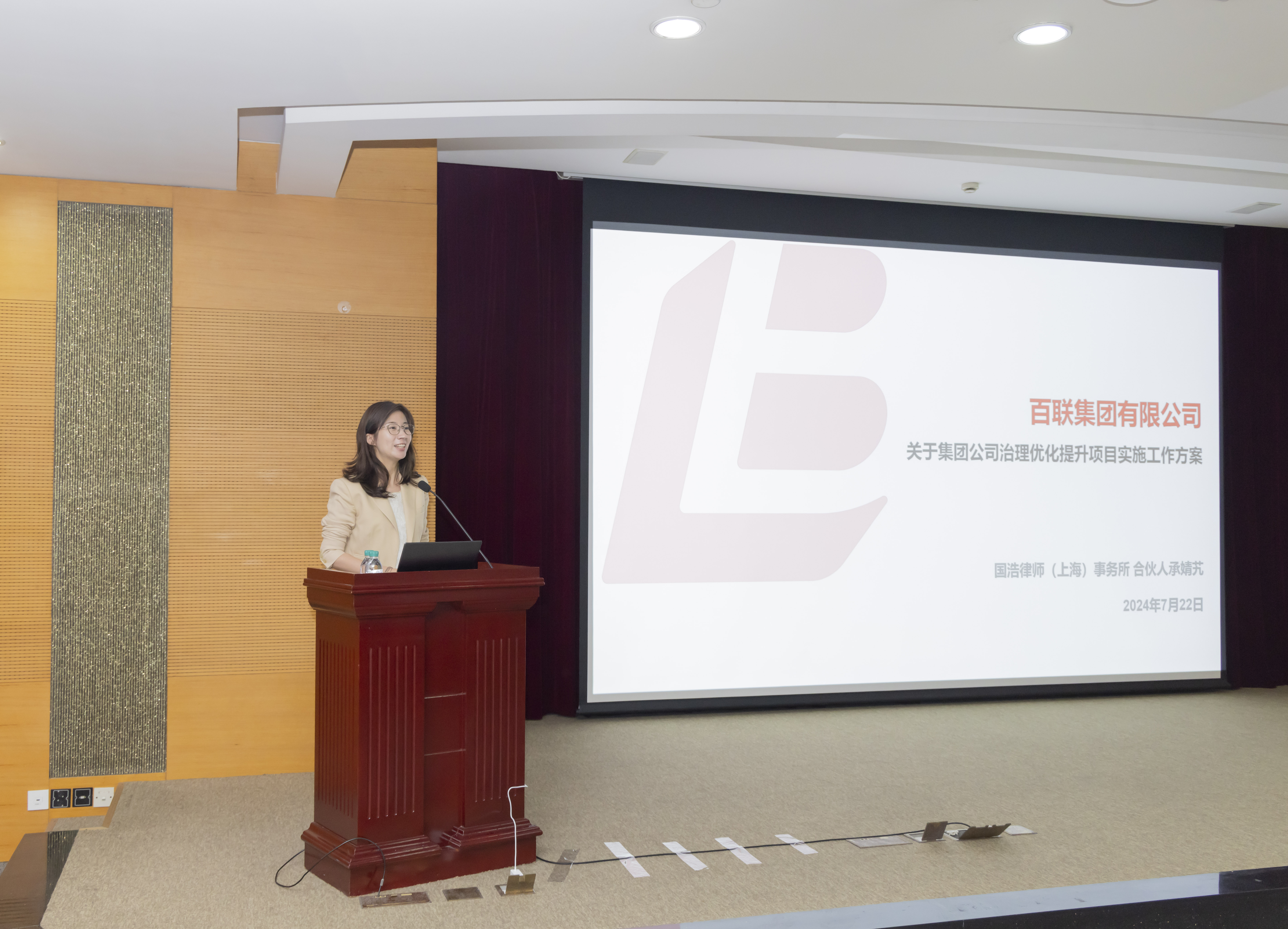 为深入学习贯彻党的二十届三中全会关于进一步全面深化改革的精神,结合新《公司法》实施的新要求,并响应国务院国资委关于“扎实推进国企改革深化提升行动”的号召,深化上海市国资委《关于进一步完善市国资委监管企业公司治理的实施意见》,在百联集团深入推进“自驱敏捷市场主体建设”“二级企业专职董事长制度实施”等重点工作的背景下,7月22日上午,百联集团召开公司治理优化提升项目启动会,旨在体系化提升公司治理水平,强化治理协同,增强企业治理能力、规范建设与高效运作,激发企业经营层活力,促进高质量发展。集团党委书记、董事长叶永明主持会议并讲话,国浩律师事务所团队进行项目方案启动汇报。