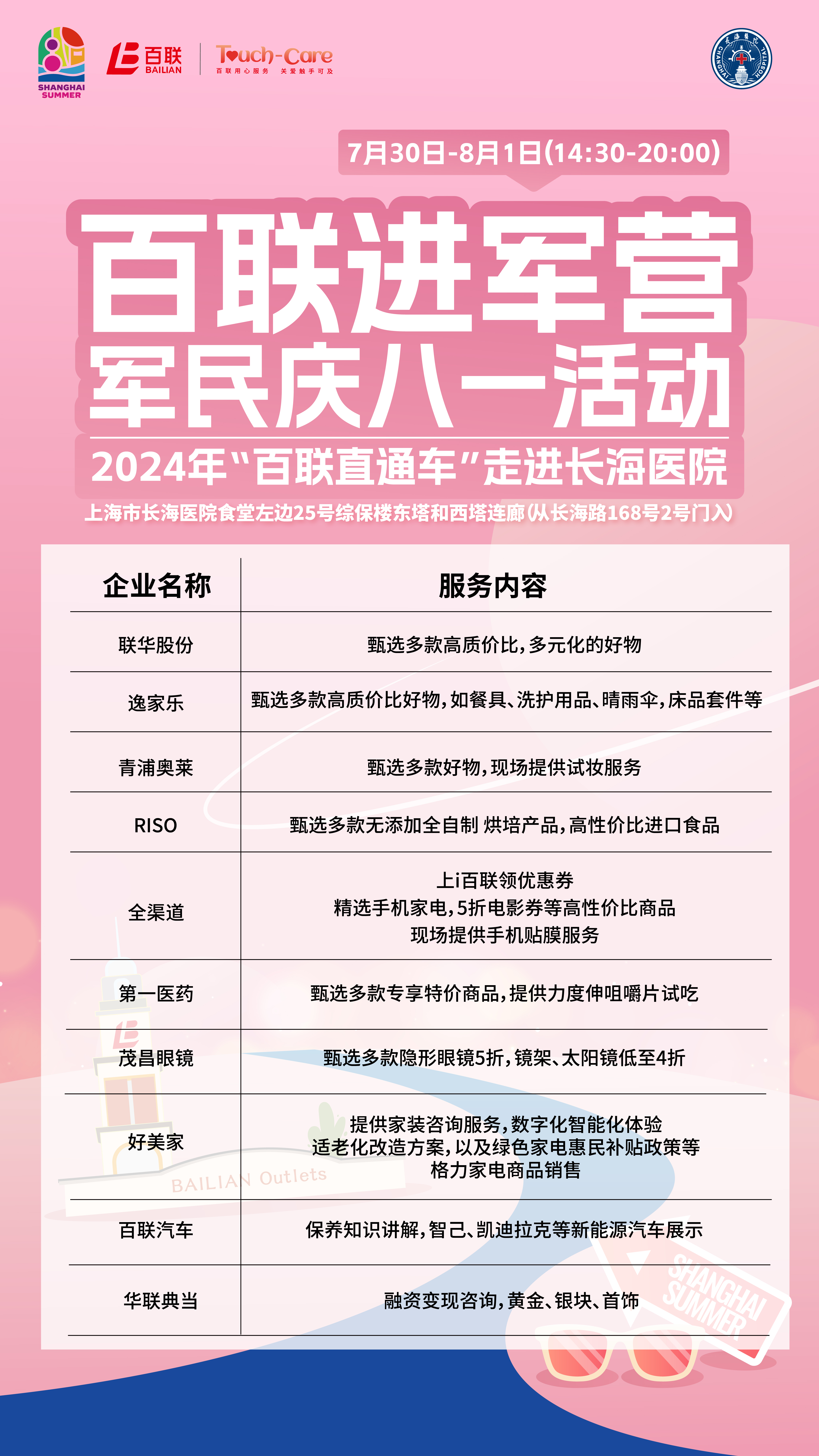 在“八一”建军节来临之际,7月30日—8月1日,百联集团旗下联华携手多家集团业态企业,共同走进海军军医大学第一附属医院(上海长海医院),开展一场别开生面的“百联进军营 军民庆八一”百联直通车系列活动。