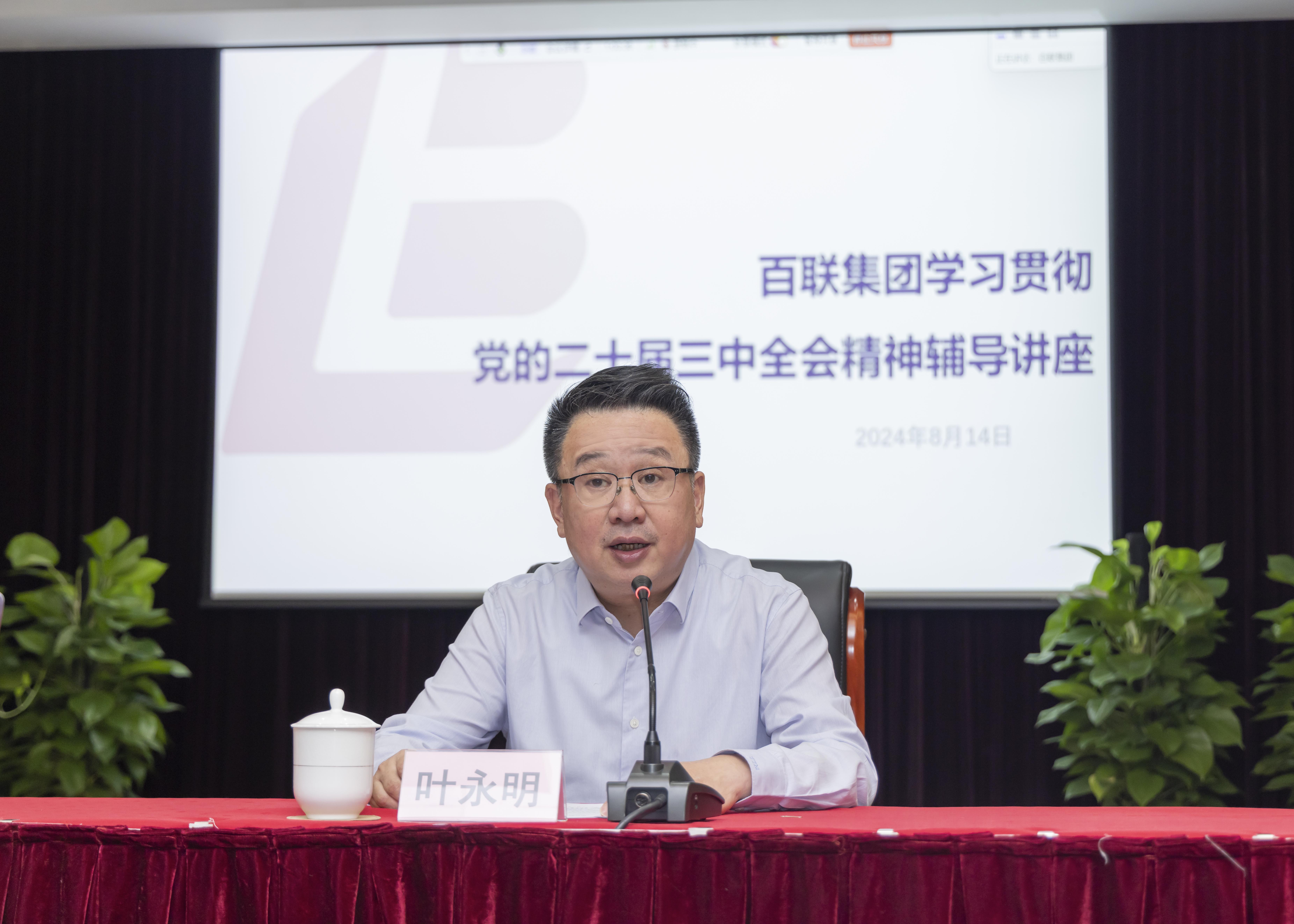 为推动百联集团上下全面准确领会党的二十届三中全会精神,迅速掀起学习宣传贯彻热潮,8月14日上午,集团举办学习贯彻党的二十届三中全会精神专题辅导,邀请上海市学习贯彻党的二十届三中全会精神宣讲团成员、上海财经大学校长刘元春教授为集团系统党员干部作专题报告。集团党委书记、董事长叶永明主持会议。