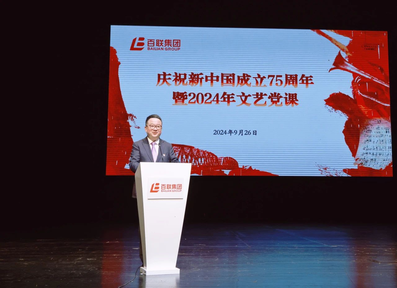 集团党委书记、董事长叶永明为本次文艺党课开课。叶永明指出,今年是新中国成立75周年,是“十四五”战略规划的攻坚之年,也是百联打造具有生机和活力的现代新型商业产业集团、实现高质量跨越发展的关键之年。百联各级党员干部要通过上好这一堂文艺党课,做好三个方面:一要进一步传承红色经典、根植爱国情怀。文艺党课是承载与传承红色资源的重要载体。广大党员们要在高昂激越、催人奋进的旋律中,激发家国情怀、民族自豪,从中感悟爱国旋律所诠释的中国精神,在波澜壮阔的百年党史中感悟信仰的光辉和真理的力量。二要进一步赓续红色血脉、强化党性教育。在价值观多元、传播手段多样的背景下,党课既要守稳方向、守住立场,也要因势而变、与时俱进。要让党课“会场”变为艺术“剧场”,让广大党员喜闻乐见、愿听爱学,自觉在传承弘扬红色文化中接受深刻的党性教育和精神洗礼。三要进一步迸发红色激情、激扬干事热情。各级党组织要依托文艺党课等“沉浸式”教育载体,用红色经典的感染力、凝聚力、向心力与宣传力,教育引导党员干部职工坚定信心、奋力拼搏,以更加昂扬的姿态积极投身国企改革深化提升行动,为加快构建“一核三柱”高效协同的现代新型商业产业集团汇聚起强大精神动力。