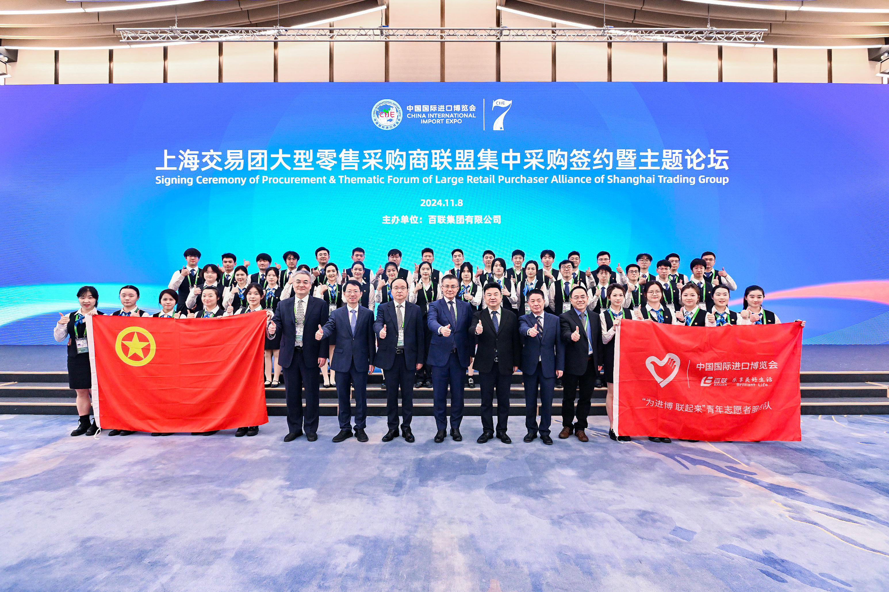 2024年11月5日至10日,第七届中国国际进口博览会在国家会展中心(上海)如期举行。百联the bálancing展台亮相6.2H消费品展区,上海交易团大型零售采购商联盟集中采购签约仪式暨主题论坛于11月8日上午成功举办。在百联集团党委的领导下,集团团委再次吹响集结号角,成立“为进博 联起来”青年志愿者服务队,近70名百联青年全力以赴,积极参与各项展会志愿服务,在进博“大舞台”中展现青春作为。