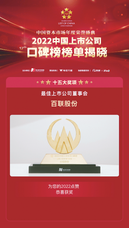近日,由中国《每日经济新闻》主办的中国资本市场年度荣誉盛典——“2022第十二届中国上市公司口碑榜”重磅发布,百联股份凭借前瞻的战略引领、日益优化的公司治理结构,荣获...2023-01-16了解更多 -