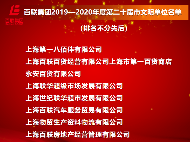 4月27日,市文明办公布沪文明城区、文明行业、文明单位、文明校园名单,其中百联集团下属43家单位荣获“2019-2020年度(第二十届)上海市文明单位”称号。2021-04-29了解更多 -