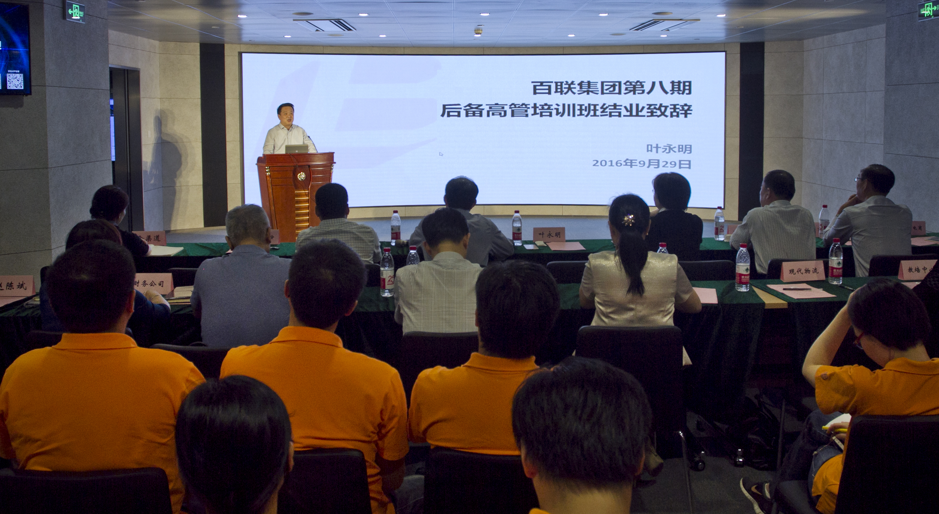 (图为董事长、党委书记、总裁叶永明在毕业典礼上致辞) (图为学员代表上台领取结业证书) 9月29日下午,百联集团第八期后备高级管理人员培训班结业典礼在集团5楼创新体验中心举行。...2016-09-30了解更多 -