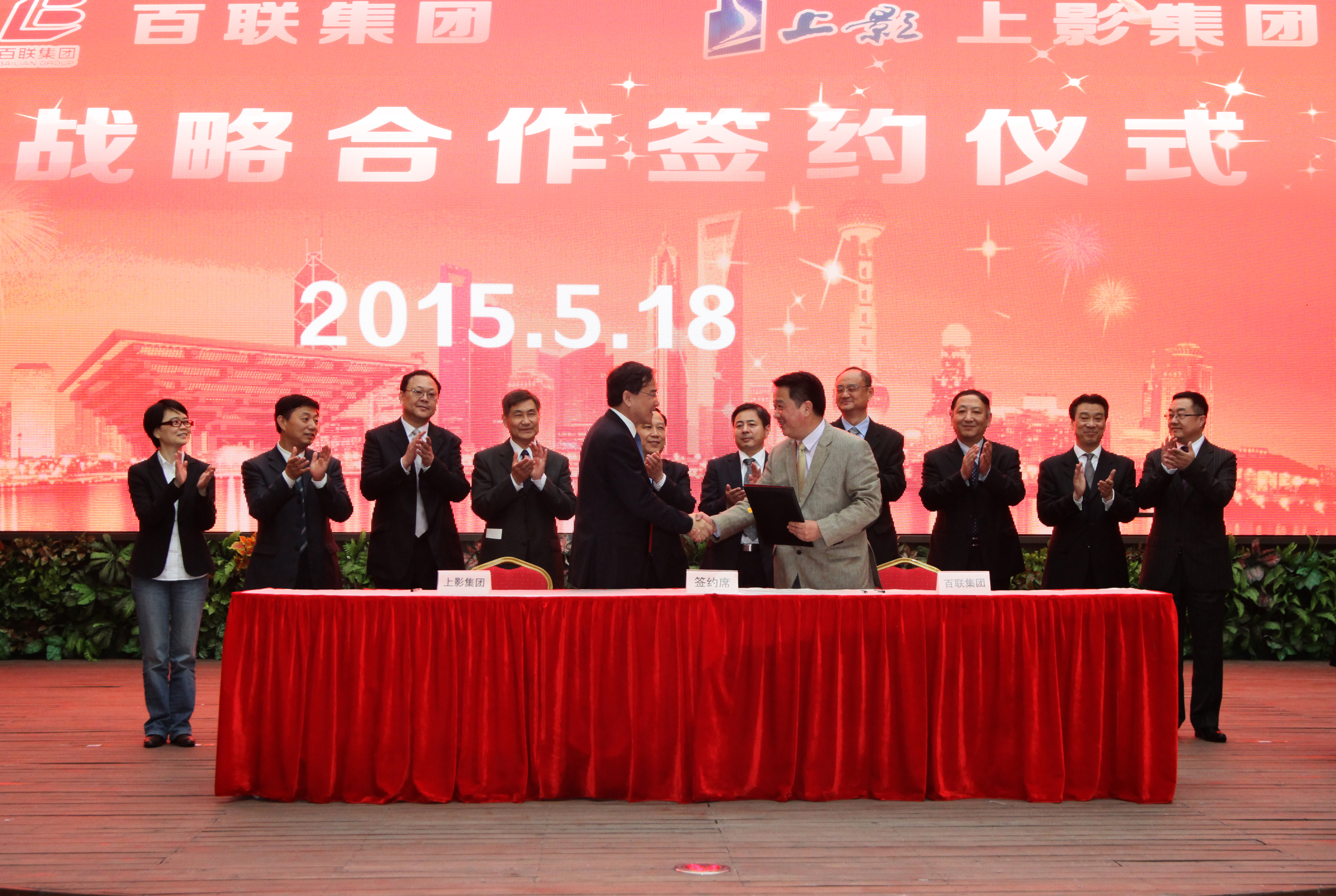 (集团总裁叶永明与上影集团总裁任仲伦代表双方签约并互换文本) (市国资委副主任林益彬讲话祝贺) 5月18日下午,百联集团与上海电影集团在上海世博源购物中心签署战略合作框架协议,同...2015-05-19了解更多 -