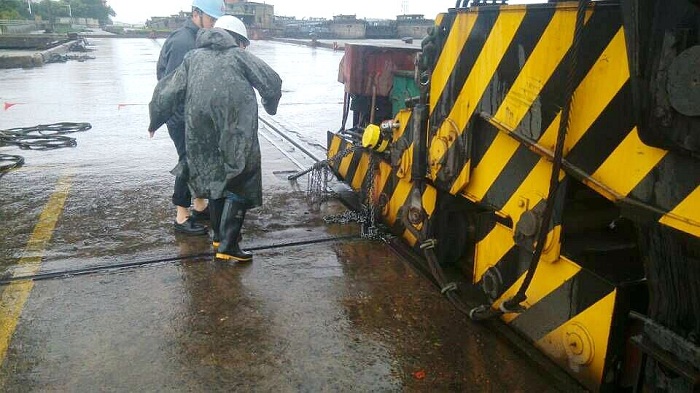 随着台风等级的逐步升高,生资物流公司召开安委会人员紧急会议,启动防台II级应急预案,公司分管领导24小时到岗处置防台防汛工作;安全保卫等五个部门派出抢险队伍共计37人坚守在抗击“灿鸿”第一线,对设备设施、作业场所、码头堆场、办公场地等进行定时全面检查,特别对行车、门机锚定、夹轨,电网设备等实行了防风加固、严密监查;同时疏散了作业区居住人员,确保万无一失。