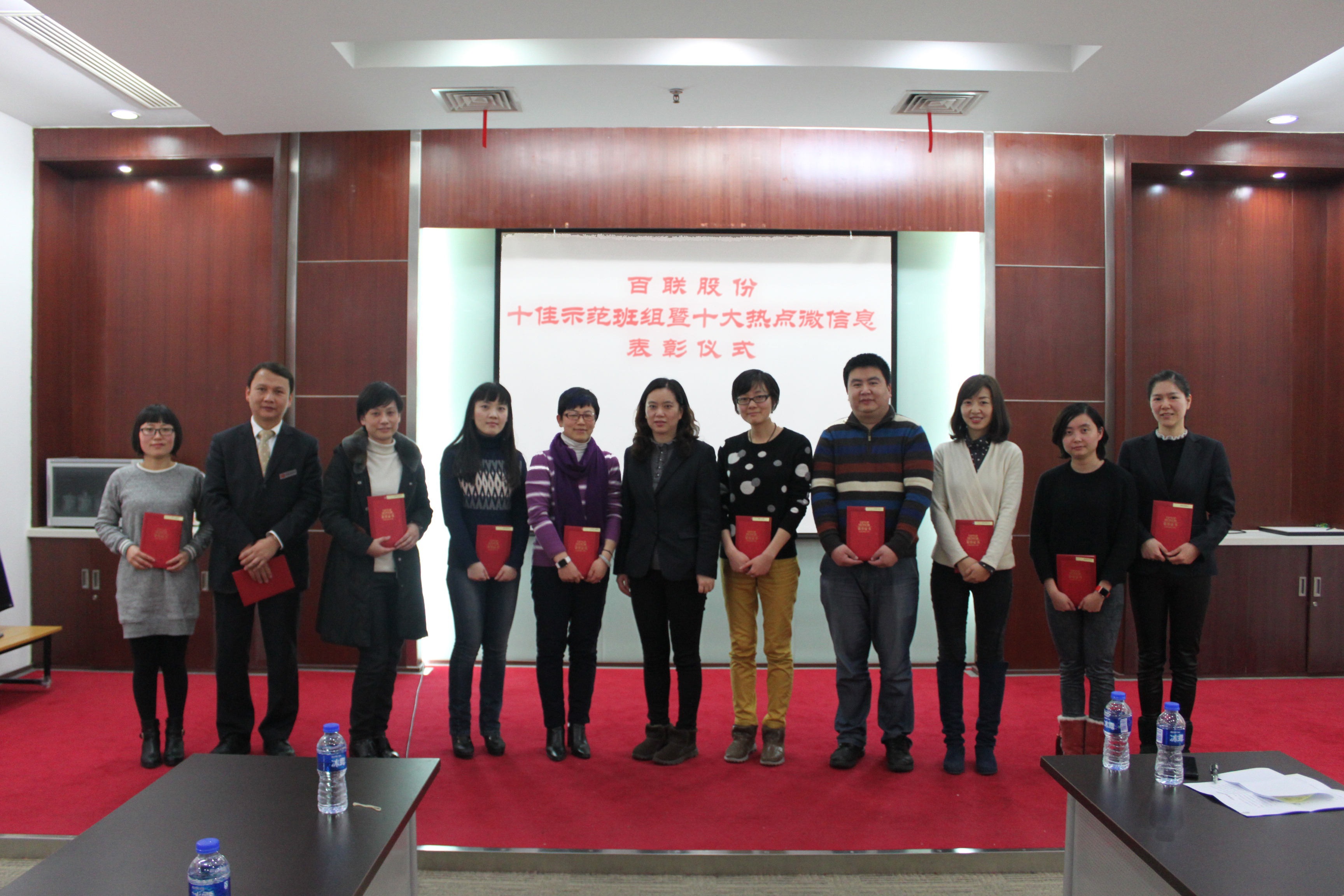 为加强班组建设,2015年底,百联股份党委组织开展了“十佳示范班组”评选活动,得到了成员企业的积极响应。各企业既把评选活动当作是强化班组建设的有效手段,更把它作为基层推动改革转型发挥能动性的检验标准。经过层层筛选,涌现了以第一八佰伴营运管理部为代表的,在推进电子商务、单品管理中发挥积极作用的“最富创新力”班组;以百联又一城购物中心五星客服组为代表的开展“五大特色服务”,让顾客享受家一般温馨的“最具影响力”班组;以百联中环购物广场商务电子化转型项目推进小组为代表的通过线上线下融合吸引大客流,为企业经营做出突出贡献的“最具推动力”班组。 “十佳示范班组”评选活动着力推动了一线班组成为与转型发展实现同频共振、激发活力的健康细胞。