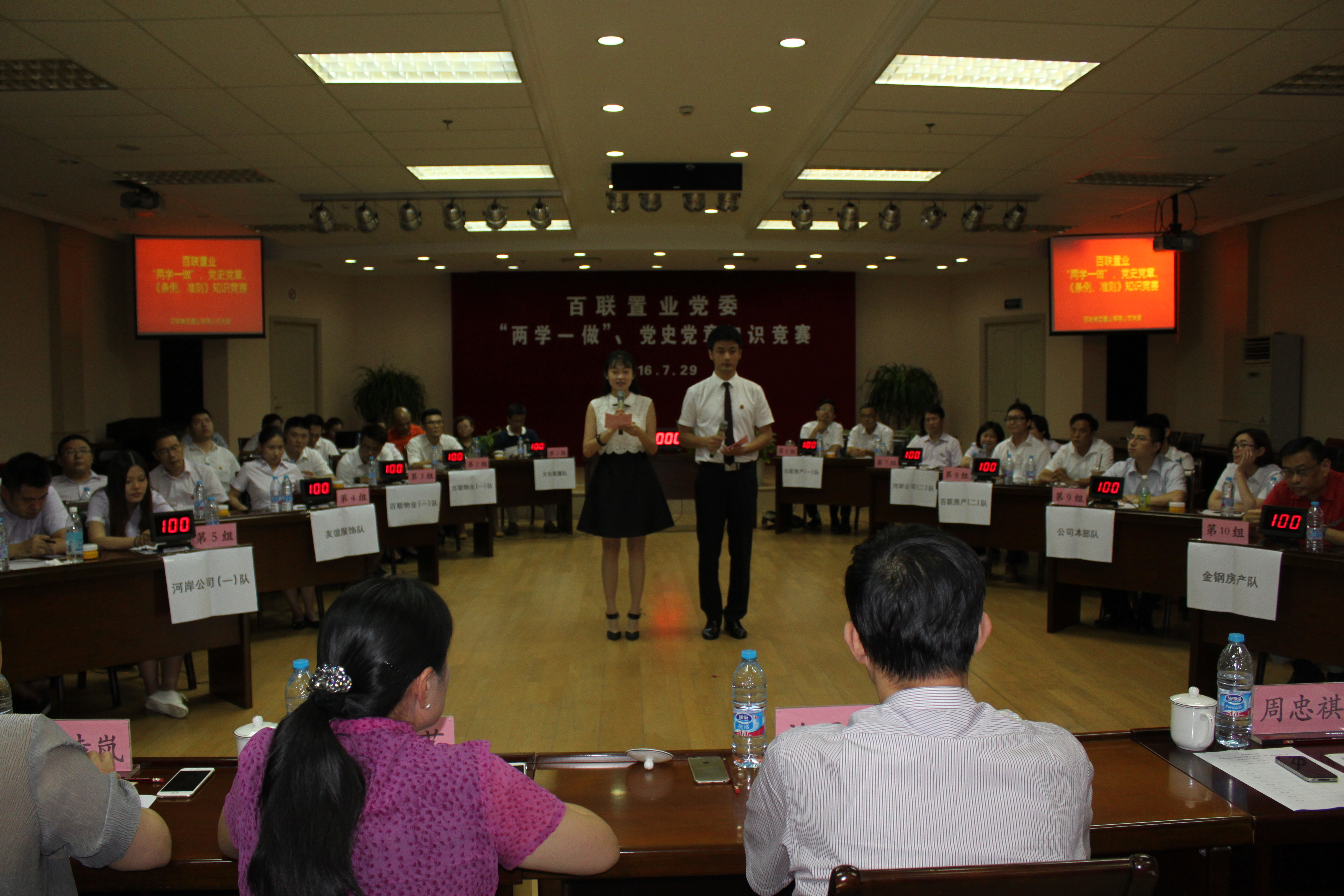 7月29日,百联置业公司党委举行“两学一做”、党史党章知识竞赛。活动旨在进一步营造“两学一做”浓厚的学习氛围,激发广大党员干部的学习热情,将党章党规及习近平总书记系列讲话精神等学深学透、入脑入心;积极教育引导广大党员、干部尊崇党章、遵守党规,以习近平总书记系列重要讲话精神武装头脑、指导实践、推动改革;进一步增强政治意识、大局意识、核心意识、看齐意识,争当“讲政治、有信念,讲规矩、有纪律,讲道德、有品行,讲奉献、有作为”的合格党员,充分发挥共产党员的先锋模范作用,全面促进百联置业的创新转型。