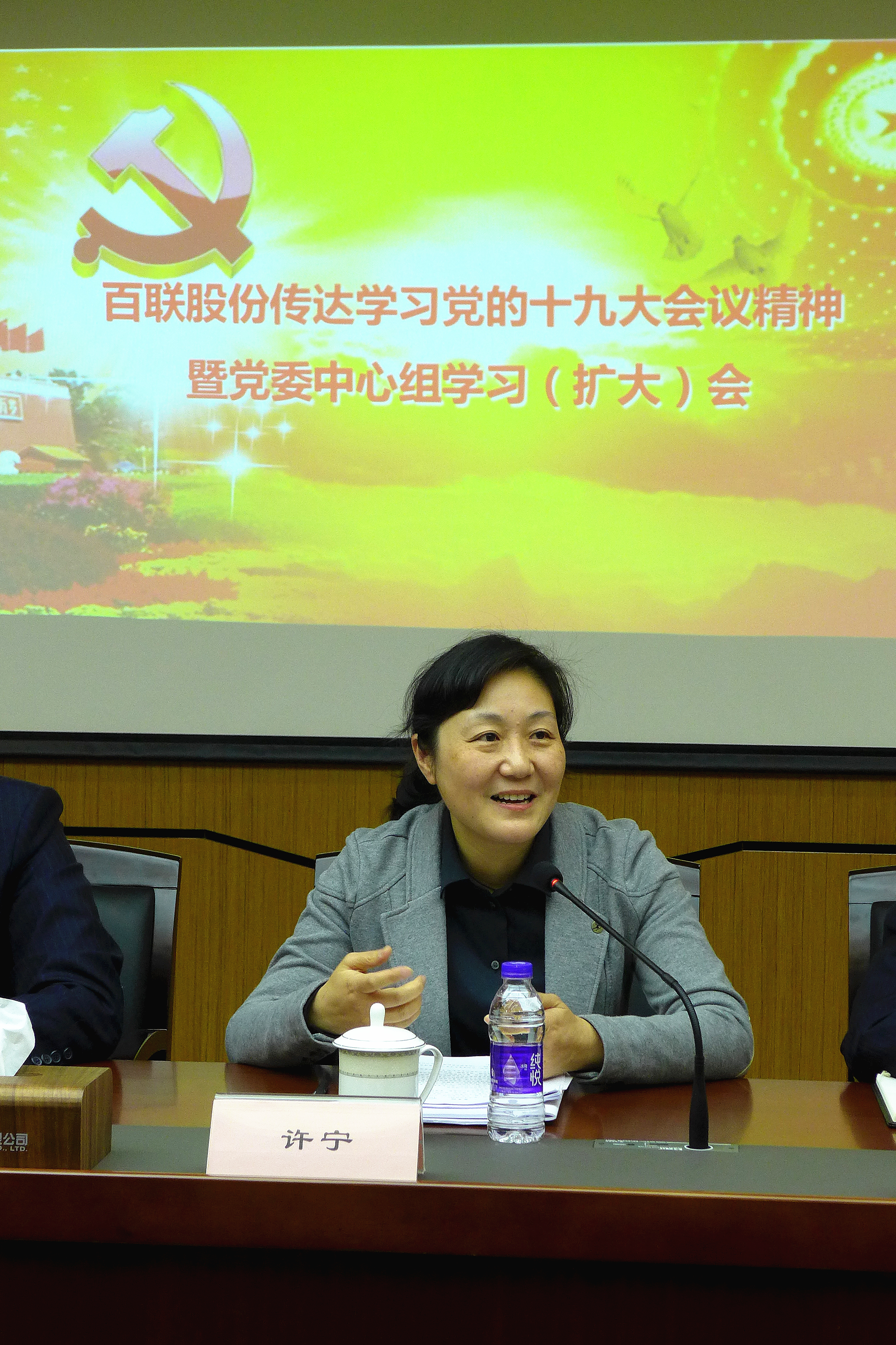 10月30日下午,百联股份党委召开党委中心组学习(扩大)会,传达学习党的十九大会议精神。刚刚圆满完成各项任务顺利返沪的党的十九大代表、东方商厦全国劳模许宁受邀,为百联股份领导班子、总部部室主要负责人,传达会议精神、分享参会感悟。百联股份党委书记、总经理钱建强主持会议。