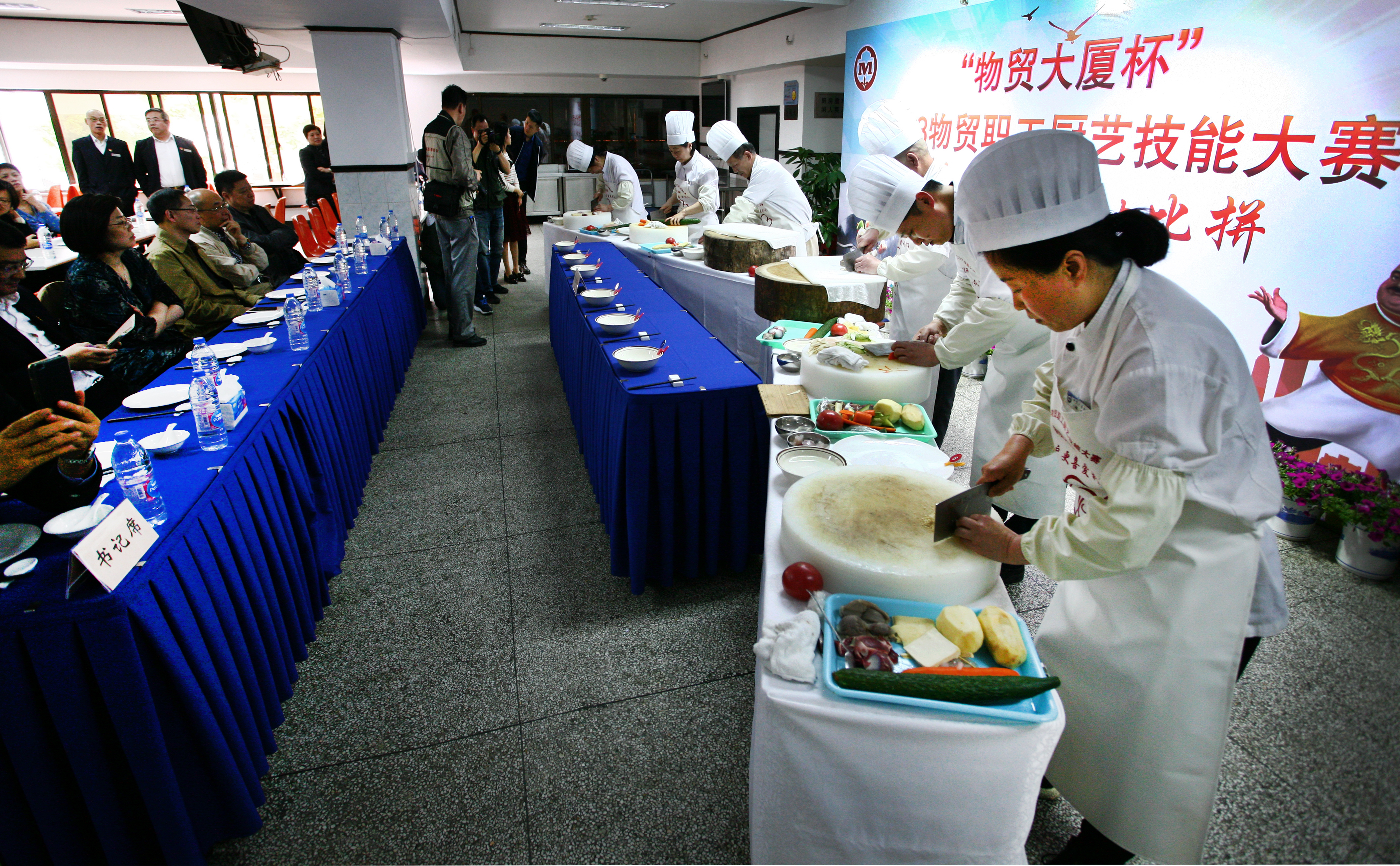 4月26日,在物贸大厦食堂内,举行了2018年物贸股份职工技能比赛的首场比赛——职工厨艺大赛。大赛共设有三个竞赛项目,分别为:切配拼盘、指定菜肴烹饪、自选菜肴烹饪。在初赛选拔的基础上,6个参赛队,共计18名厨师热情参与竞赛,挥铲舞勺,各展其能,烹饪出了金龙闹海、糟溜鱼片、松子桂鱼等可口佳肴,最终由大众评审品鉴后投票决出了一、二、三等奖。