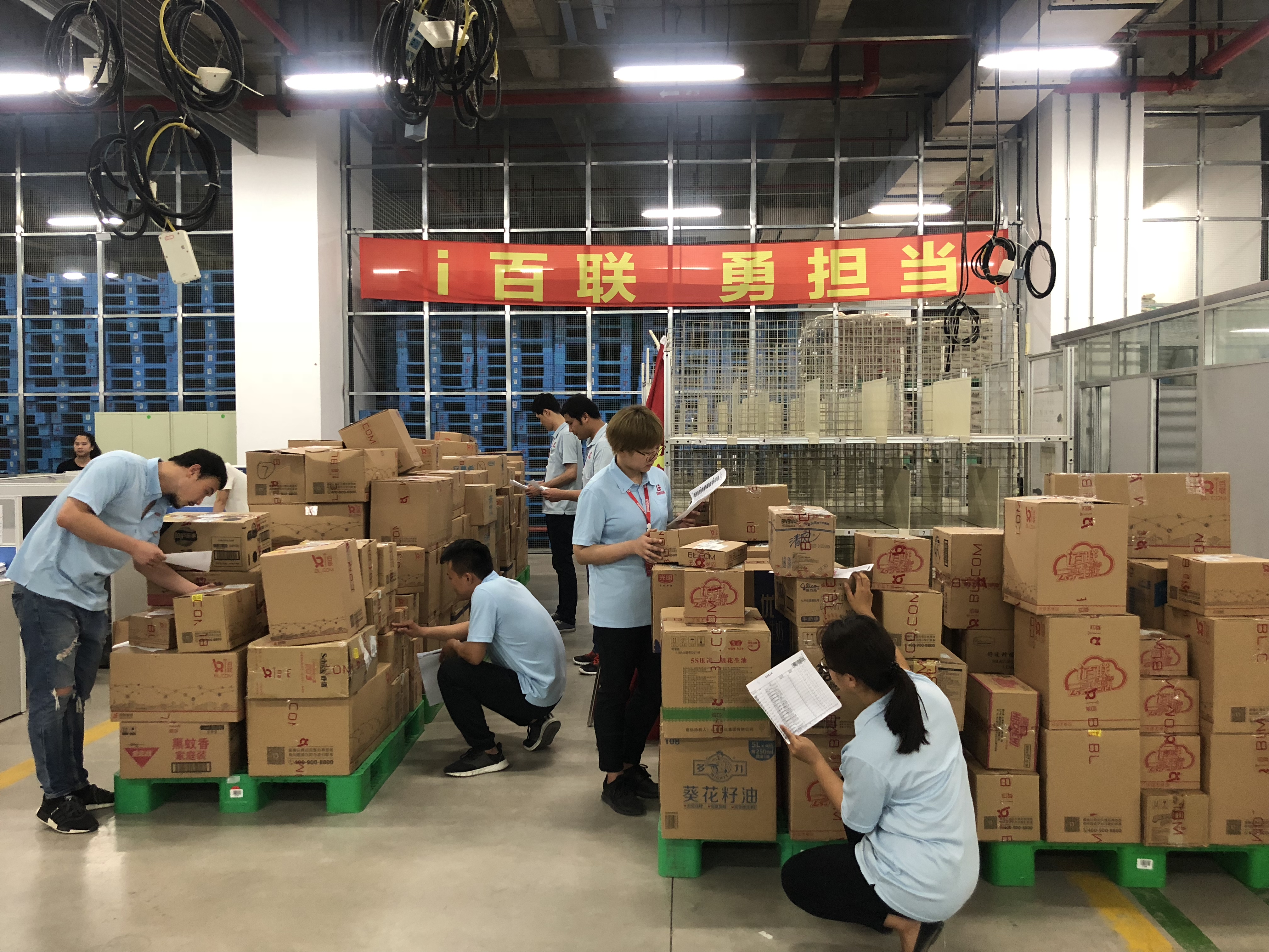 为配合集团电子商务平台“i百联”519周年庆活动,缓解因运作高峰所导致的人手短缺,现代物流组织发动本部中层管理人员、党员、入党积极分子以及各成员企业的团员青年成立突击队,冒着高温赶赴位于上海嘉定的联华物流园线上仓参与物流辅助工作。