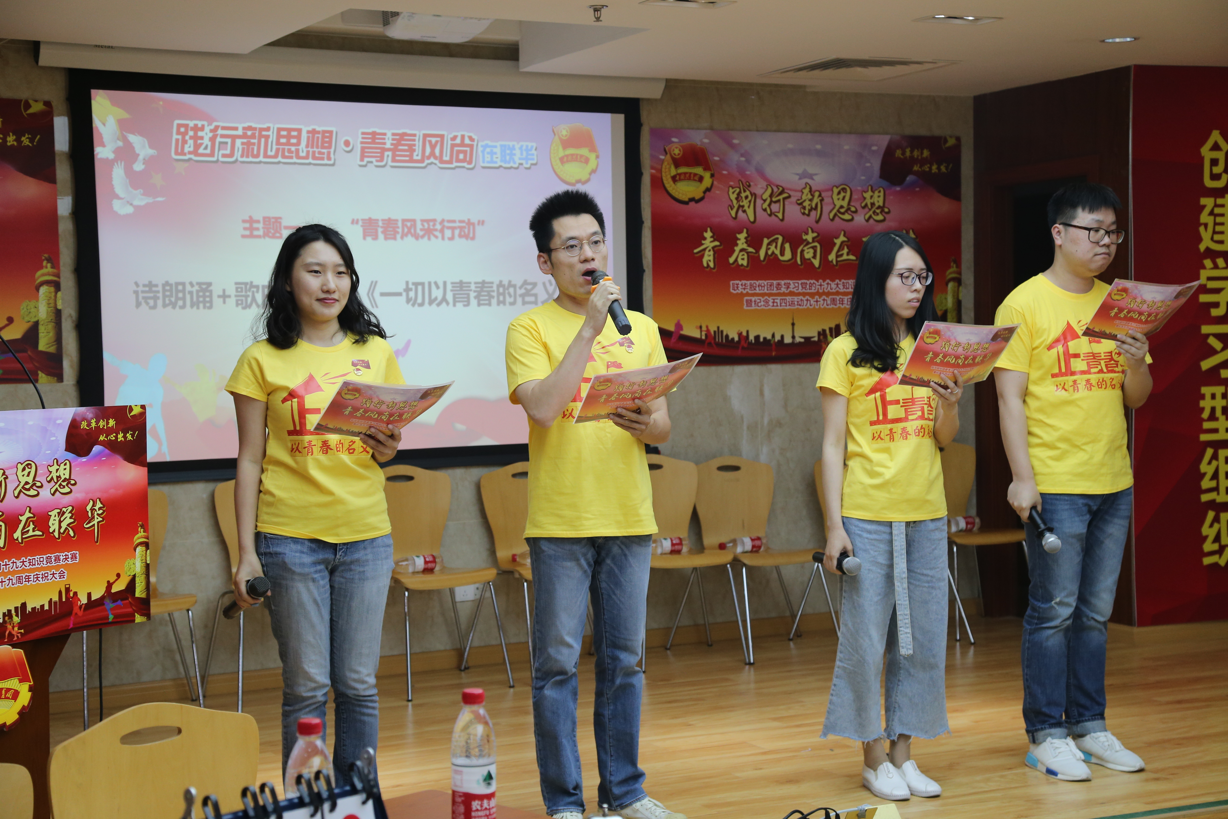 在庆祝建团96周年之际,联华青年齐聚一堂,在公司总部14楼大会场举行“践行新思想·青春风尚在联华” —— 2018年联华股份团委学习党的十九大知识竞赛决赛暨纪念五四运动99周年庆祝大会,展现广大联华青年奋发有为、积极向上的精神风貌。大会围绕四大青春行动即“青春风采行动”、“青春建功行动”、“青春创新行动”和“青春实践行动”开展。公司党委书记史浩刚,公司总经理徐涛,集团团委书记胡良玉,公司党委副书记、工会主席唐皓出席大会。史浩刚代表公司党委提出三点希望。他强调,公司各级团组织要团结带领团员青年积极为公司发展作贡献。要继续发扬“党有号召、团有行动”的优良传统,不断完善工作思路,全面履行好团的职能。一是青年要肩负使命、勇挑重担,成为企业建设发展的中坚力量。二是各级团组织要培养青年人才,抓好两个服务,为青年实践成才搭建平台。三是各级党组织要优化环境、创造条件,实现共青团工作的良性发展。