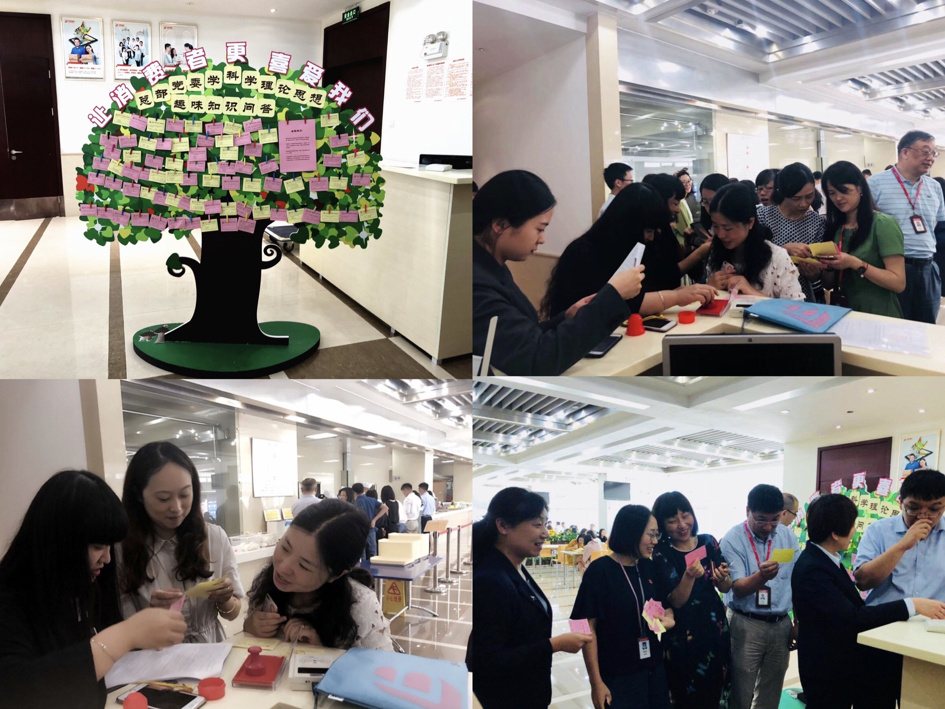 为庆祝“七一”建党97周年,6月25日至6月29日,总部党委组织开展了为期五天的“学科学理论思想”趣味知识问答活动。本次活动以习近平新时代中国特色社会主义思想、十九大报告、党章为主要内容,精心选取400道知识问答题,通过灯谜树的形式,鼓励总部广大党员、群众共同参与,以加深对党章知识的了解。活动得到了总部员工的踊跃响应,大家纷纷利用午休时间前来答题。按答题数统计,总部安全督察部蒋海屏、审计风控中心邵炯、组织干部部王韵、风控监察部童胤贤、资产清理部沈建章获得知识问答前五名。