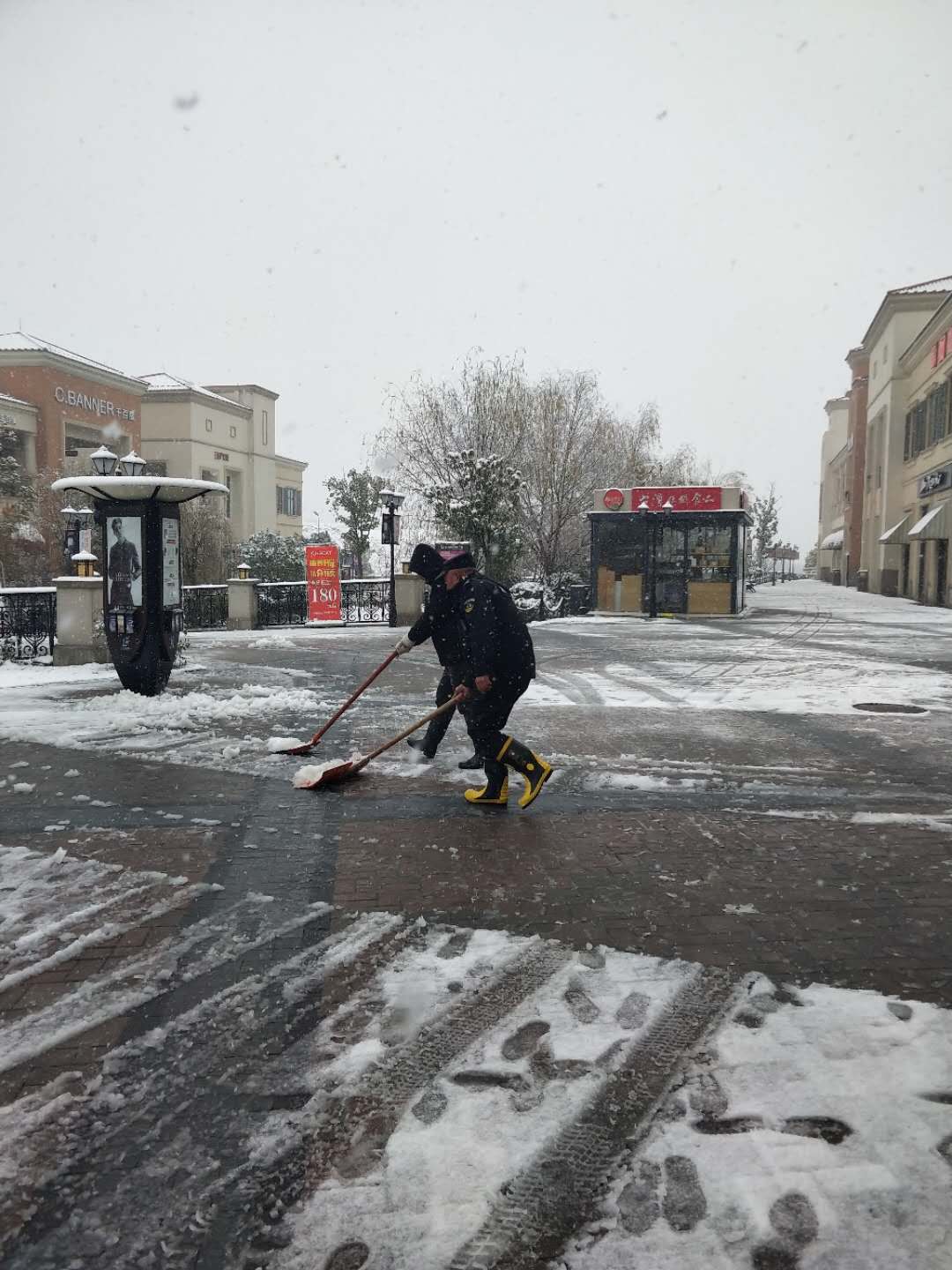 1月9日,南京迎来了新年的第一场雪,南京汤山百联奥特莱斯密切关注天气变化,提早制定应急预案,妥善安排扫雪除冰人员和物资,雪停即扫,及时清除安全隐患,确保广场区域内主干道路的安全、畅通。扫雪过程中,员工们不畏严寒、齐心协力,用铁锹、扫帚、推板等工具,将积雪和冰层铲起集中堆放,并由物业安排统一托运。