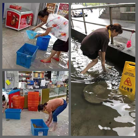 从上周五晚上七点到周日凌晨,有许多门店都经历了严峻挑战和严苛考验,当门店遭遇倒灌水、屋顶漏雨、马路雨水反排、马桶管涌等情况时,我们的大、小区长,门店店长、店助理、员工根据预案,立刻转移商品、清理积水、进行排险。