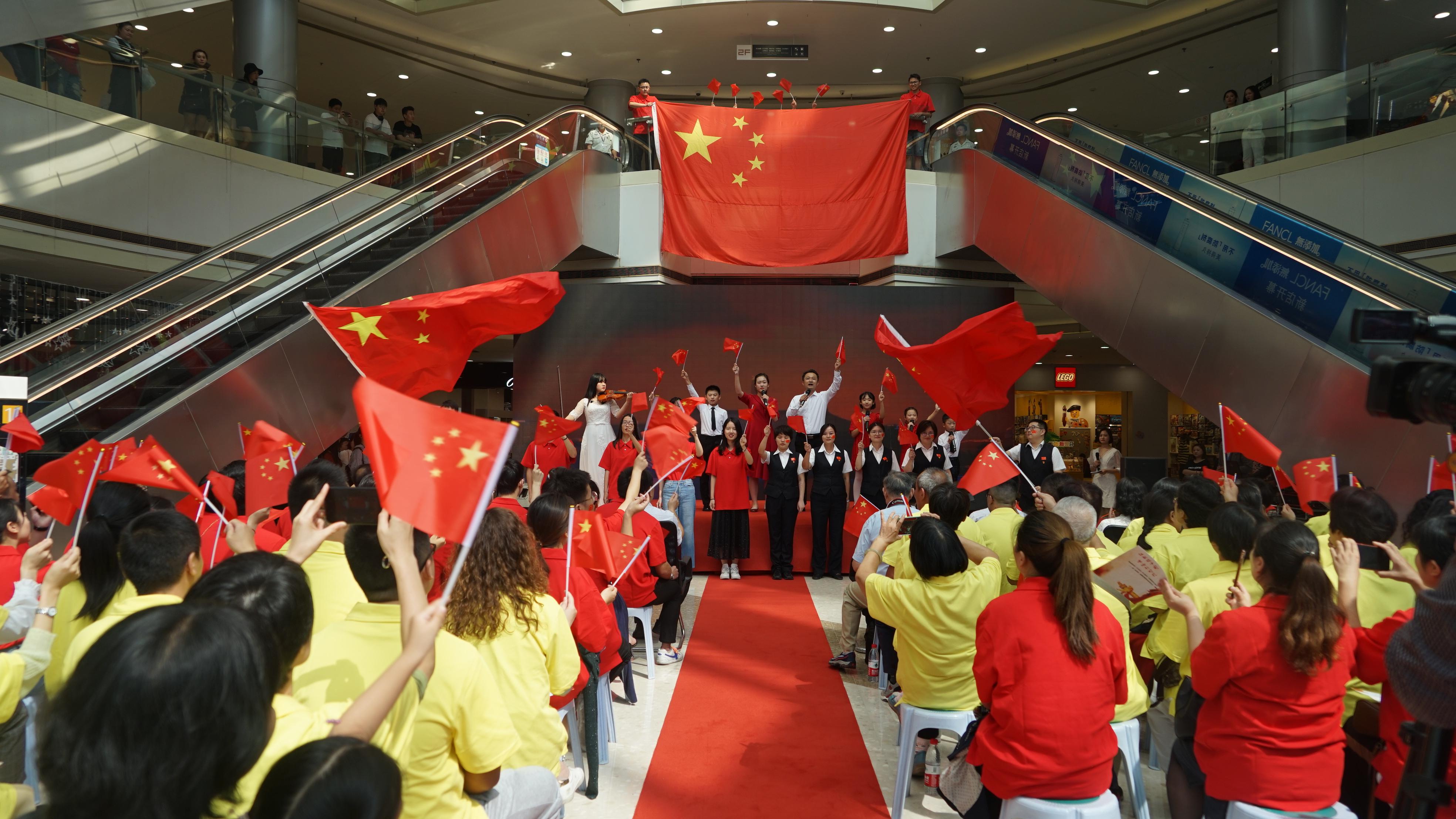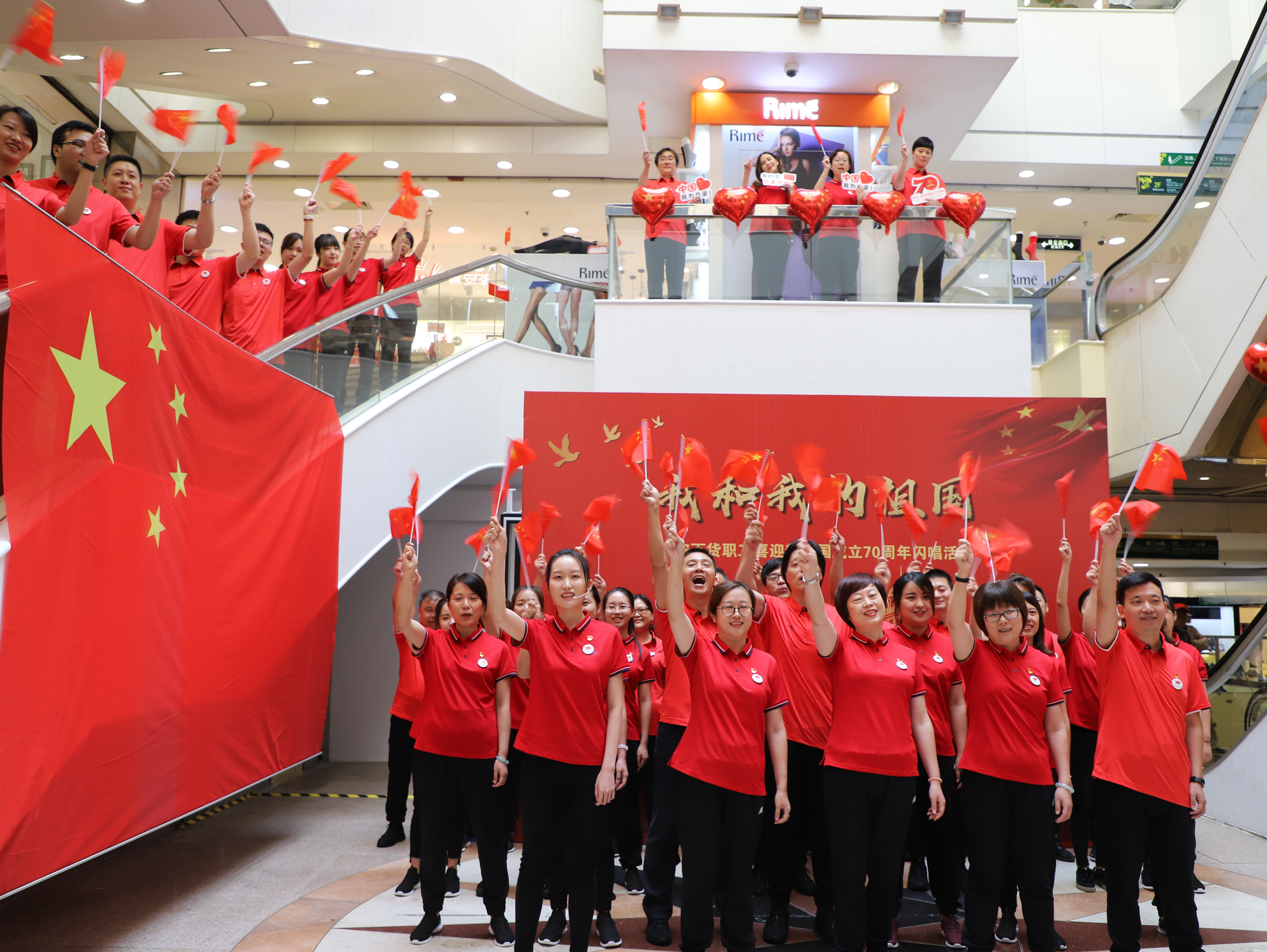 9月30日上午,随着萨克斯旋律的响起,永安百货的70多名员工自发地挥舞着五星红旗,从商场每个角落汇聚到一楼中庭,纵情高歌《我和我的祖国》,以最炙热的歌声寄托爱国之情,祝福祖国生日。