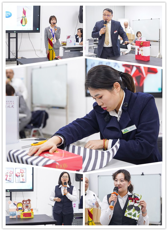 在“伴手礼创意包装”技能比武决赛现场,6位选手依次展示了自己的创意作品,并制作了精美的PPT来讲述创作思路和包装手法。有的作品以中秋节花好月圆为理念,尽显中国特色。有的作品则以圣诞为主题,凸显节日欢快气氛。随后,选手们还进行了基础矩形包装比试,比拼速度和手艺,并根据总分评选出了冠亚季军。