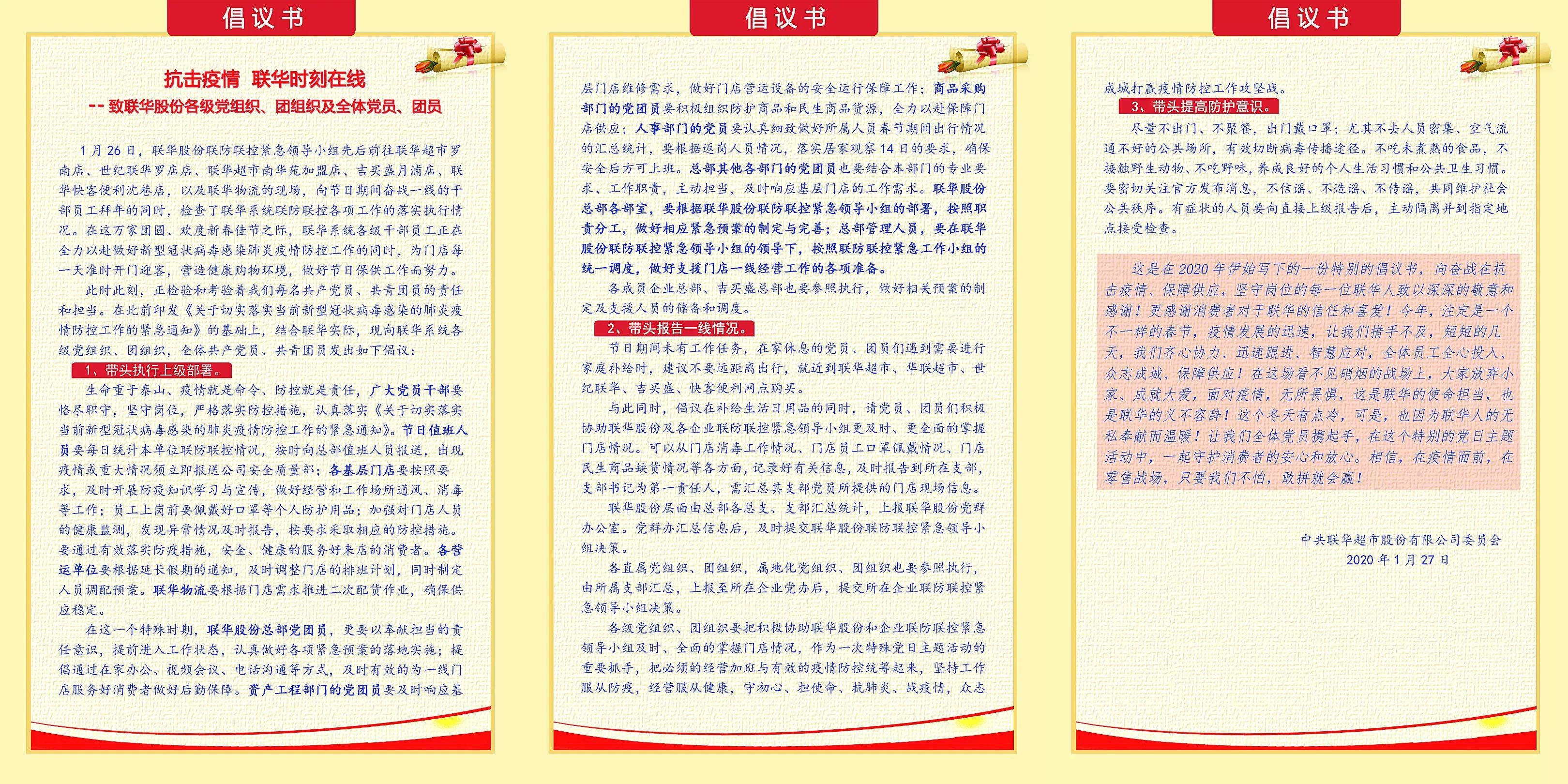 在集团党委的带领下,共同面对疫情,是联华的责任,无惧疫情的勇气,源于联华人的坚守和对零售的执着。联华各级党组织和广大党员干部第一时间响应集团党委号召,压实工作责任、履行国企职责,带头发挥作用,纷纷积极行动,落实疫情防控措施,在一品一鲜中守护广大消费者的放心和安心!
