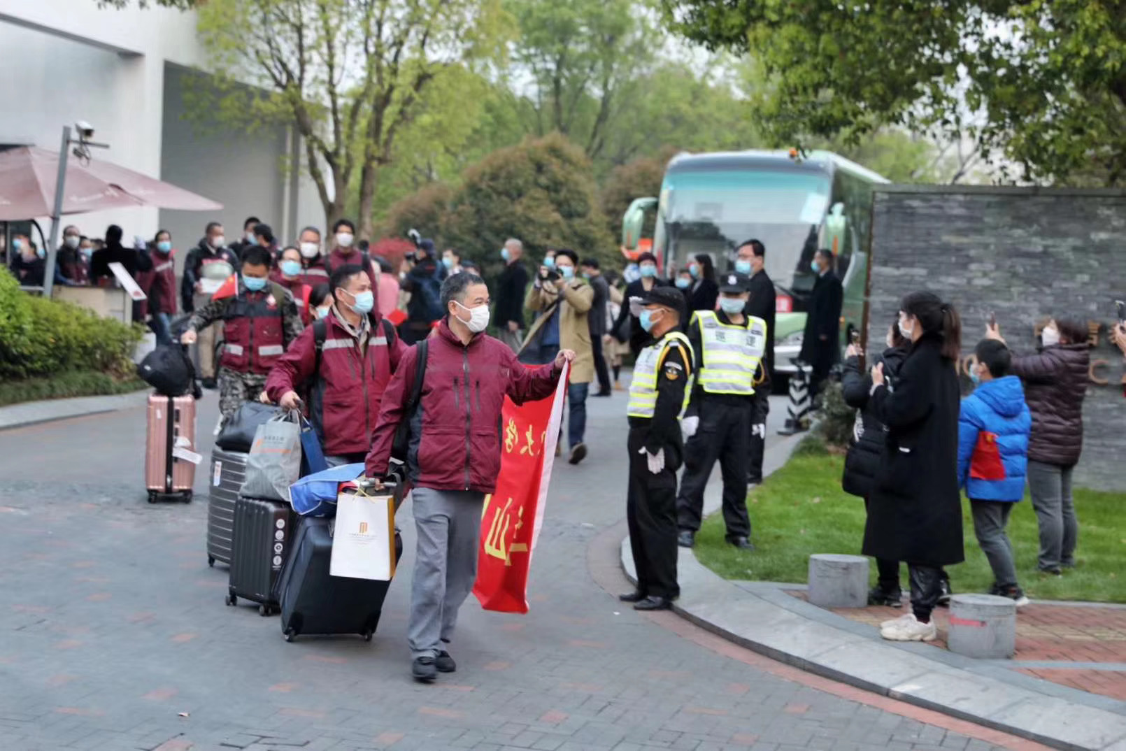 “欢迎你们回家!”“你们辛苦啦!”“回来啦,英雄们回来啦!”……晚上8点多的东方医院内,伴随着人群的欢呼声、掌声,现场所有人将“致敬白衣天使,欢迎凯旋回家”的心里话呐喊出来,共同向战“疫”英雄致敬。在隆重的欢迎仪式后,第三党支部的护送车队有序地帮助英雄们拿行李装车、安全地送英雄们回家!