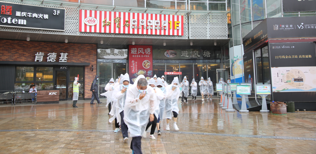 现场通过投放烟雾弹来模拟购物中心突然起火,当看到二楼、三楼冒出烟雾,我司微型消防站队员随即快速出动处置,在确认现场火情无法控制后,立即拨打119火警电话,并下达全员疏散指令。天空虽然下着雨,但公司全体工作人员在应急疏散引导员的带领下,用毛巾捂住口鼻,井然有序、快速地完成了疏散逃生。