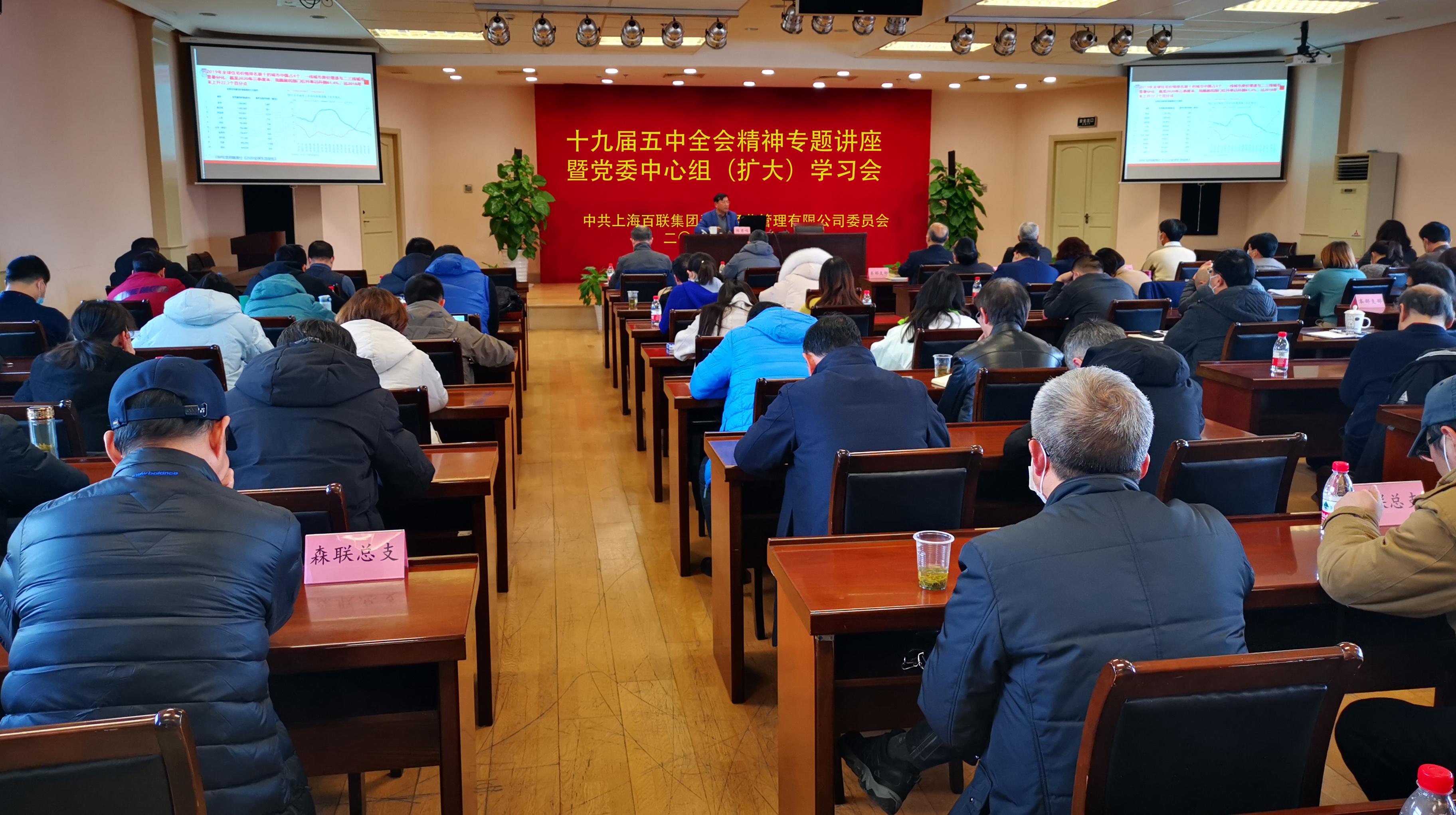 1月14日下午,百联资产党委召开中心组学习(扩大)会,邀请市委党校陈勇鸣教授作党的十九届五中全会精神专题辅导,公司党政班子成员、本部各部室负责人、成员企业党政班子成员、两办主任及公司全体党员、入党积极分子等90余人参加。